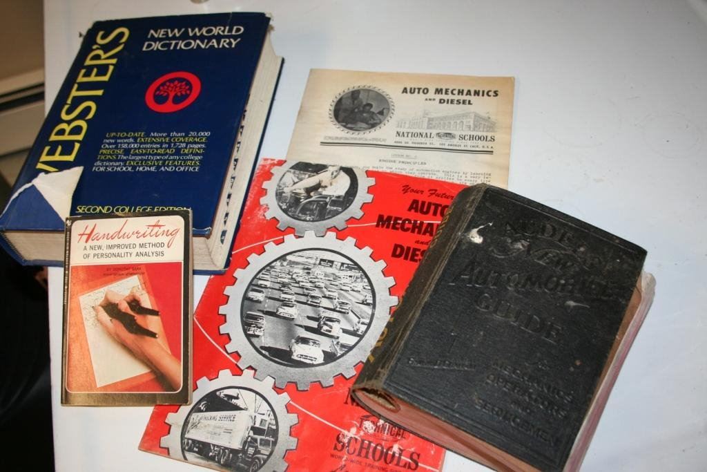 - 1954 EDITION FRANK D GRAHAM AUDEL’S NEW AUTOMOBILE GUIDE, AUTO MECHANICS AND DIESEL SCHOOL BROCHURE AND LESSON NO. 2, HANDWRITING BOOK, 2ND EDITION WEBSTER DICTIONARY