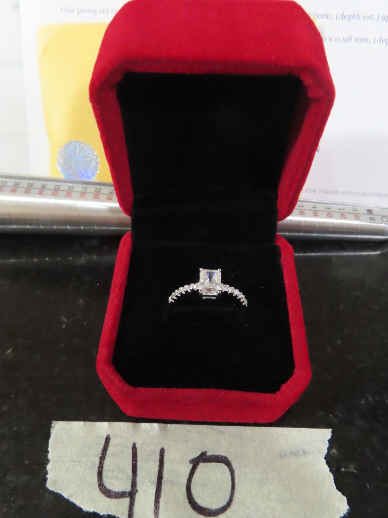1.00 CT GRA CERTIFIED RADIANT CUT MOISSANITE VVS D COLOR WITH 12 ROUND CUT CUBIC ZIRCONIUM SET IN SHANK WEIGHING A TOTAL 0.20 CT SET IN 925 SILVER RETAIL VALUE $1,000.00