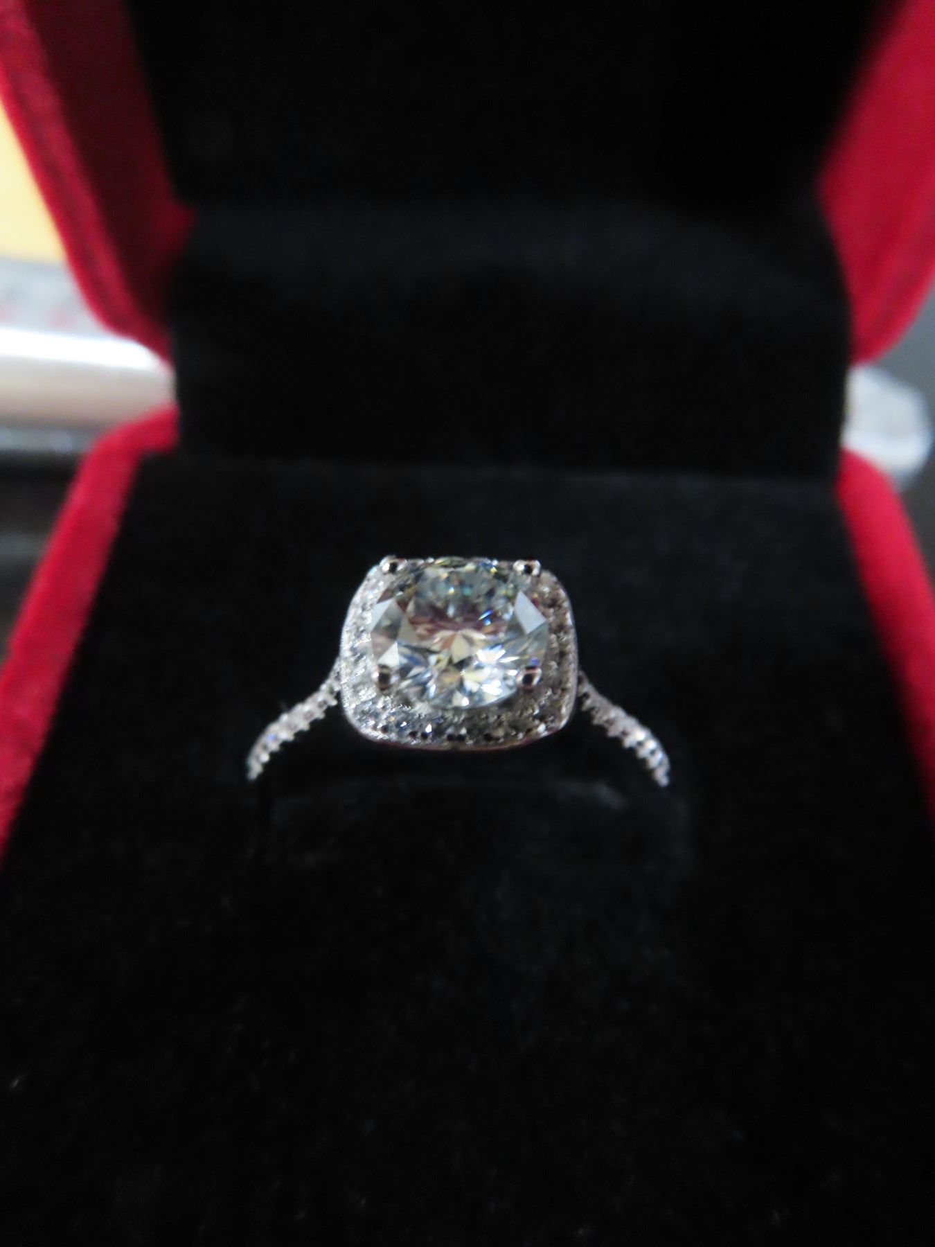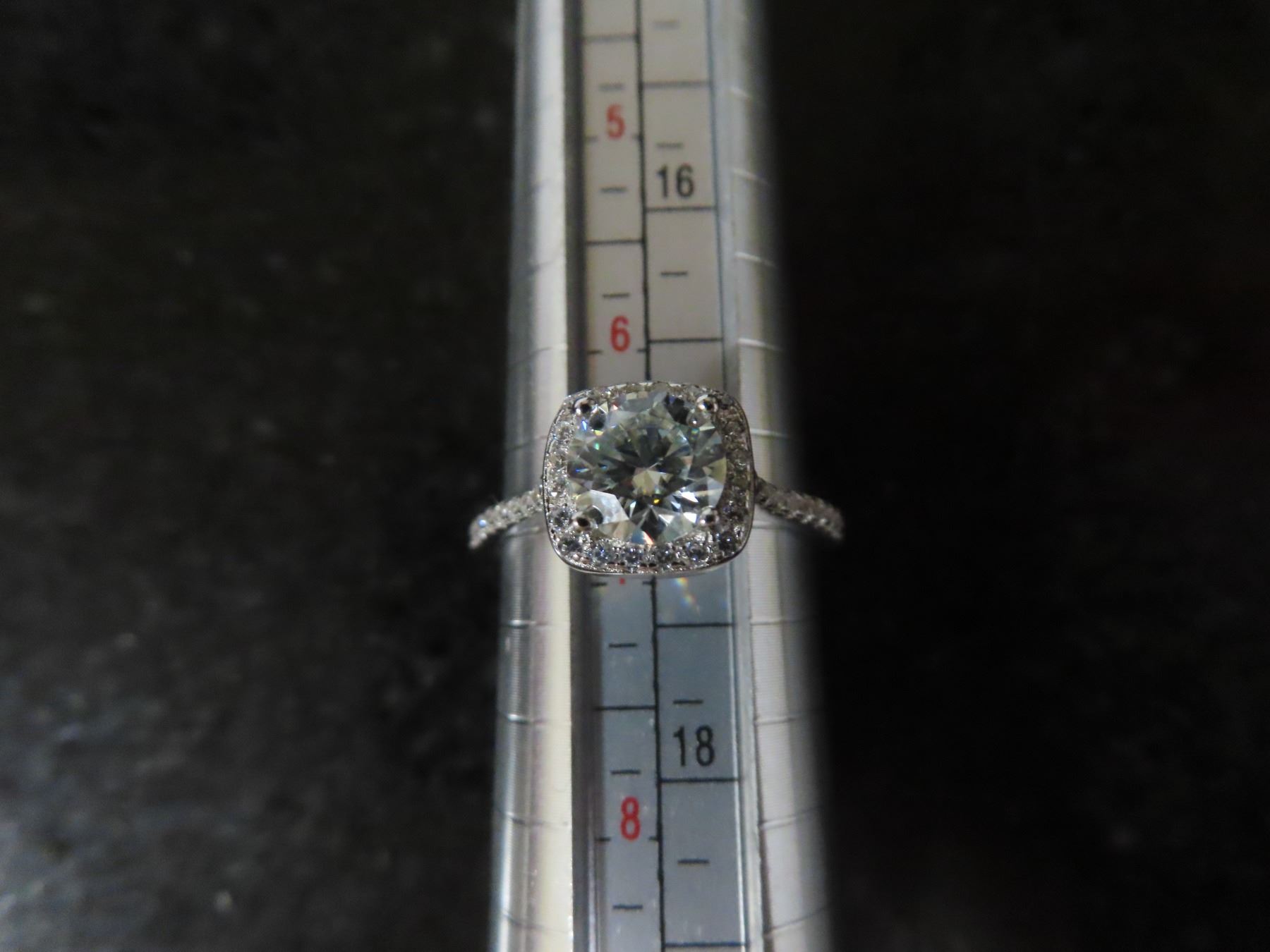 1.00 CT GRA CERTIFIED ROUND BRILLIANT CUT MOISSANITE VVS D COLOR SET IN CENTER SURROUNDED BY SQUARE HALO WITH MORE IN SHANK THE 36 ROUND CUT CUBIC ZIRCONIUM WEIGHING 0.20 CT TW RETAIL VALUE $1,000.00