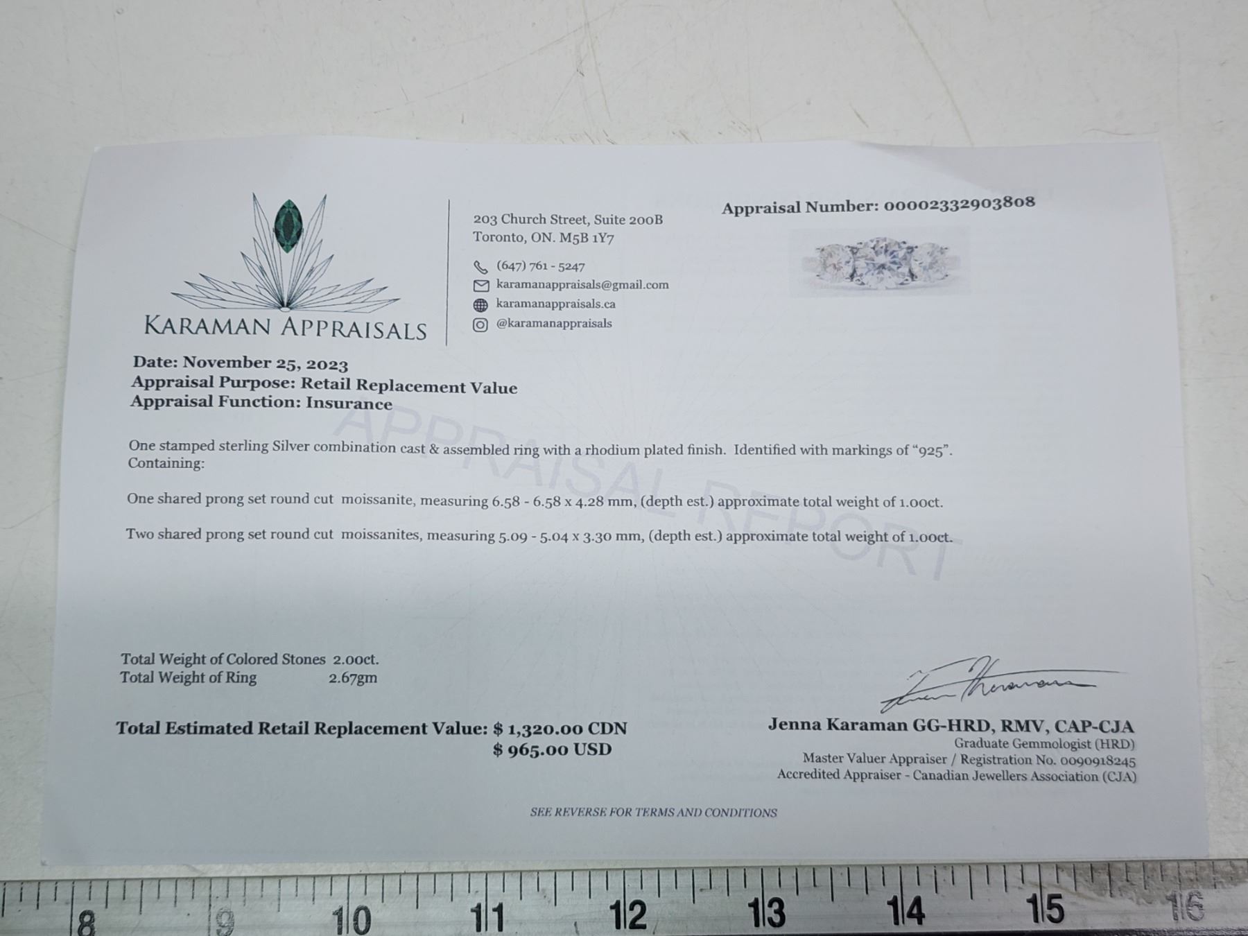 1.00 CT - Size 7.5-8 - GRA CERTIFIED ROUND BRILLIANT CUT MOISSANITE VVS D COLOR SET IN CENTER WITH 2 MORE MOISSANITE SET ON EITHER SIDE WEIGHING A TOTAL 1.00 CT SET IN 925 SILVER RETAIL VALUE $1,320.00