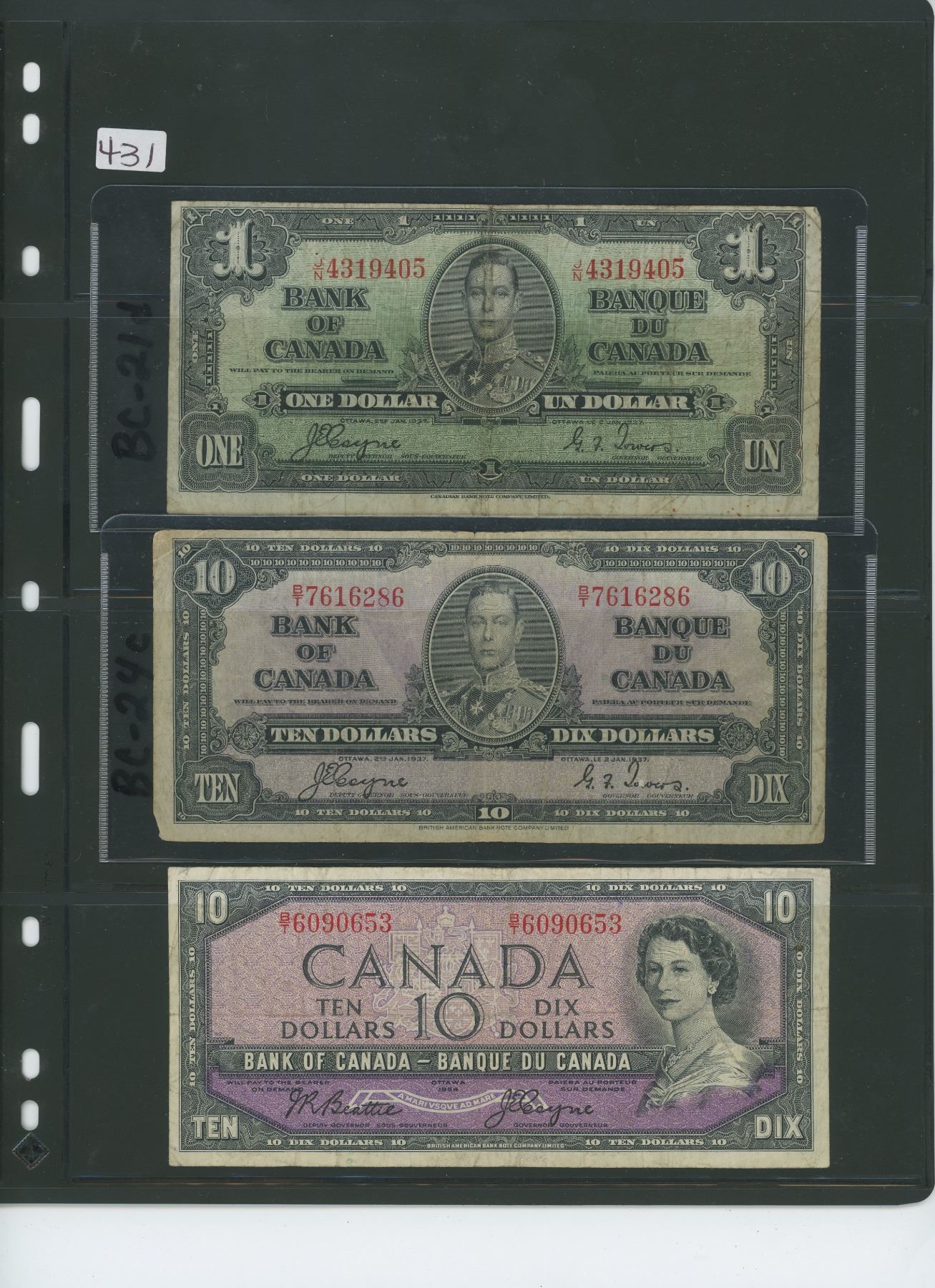 1-1937 one dollar bill, 1-1937 ten dollar bill & 1-1954 mp ten dollar bill ($21.00 face),3-Canadian bills