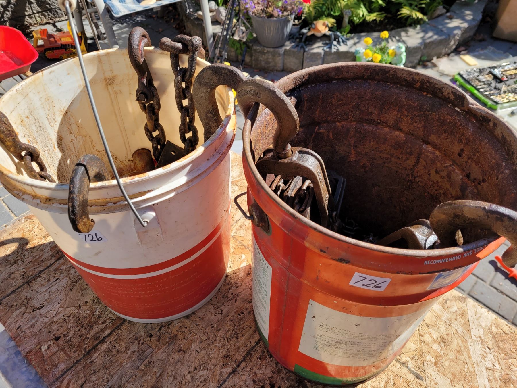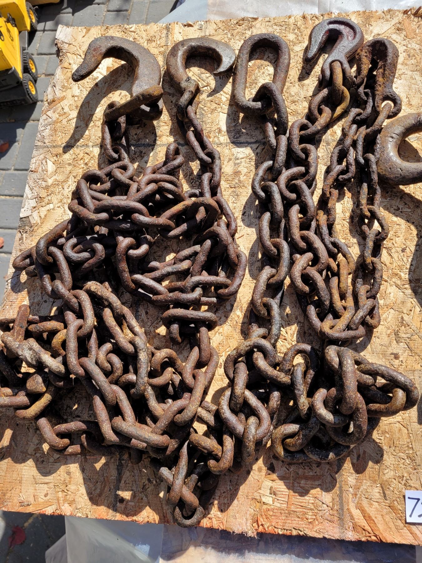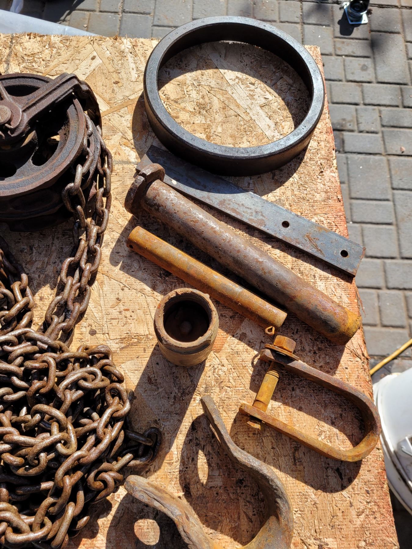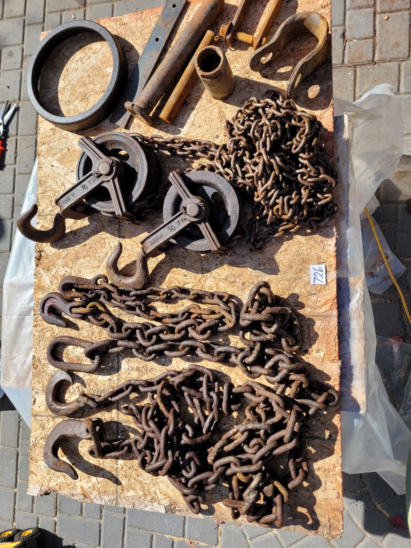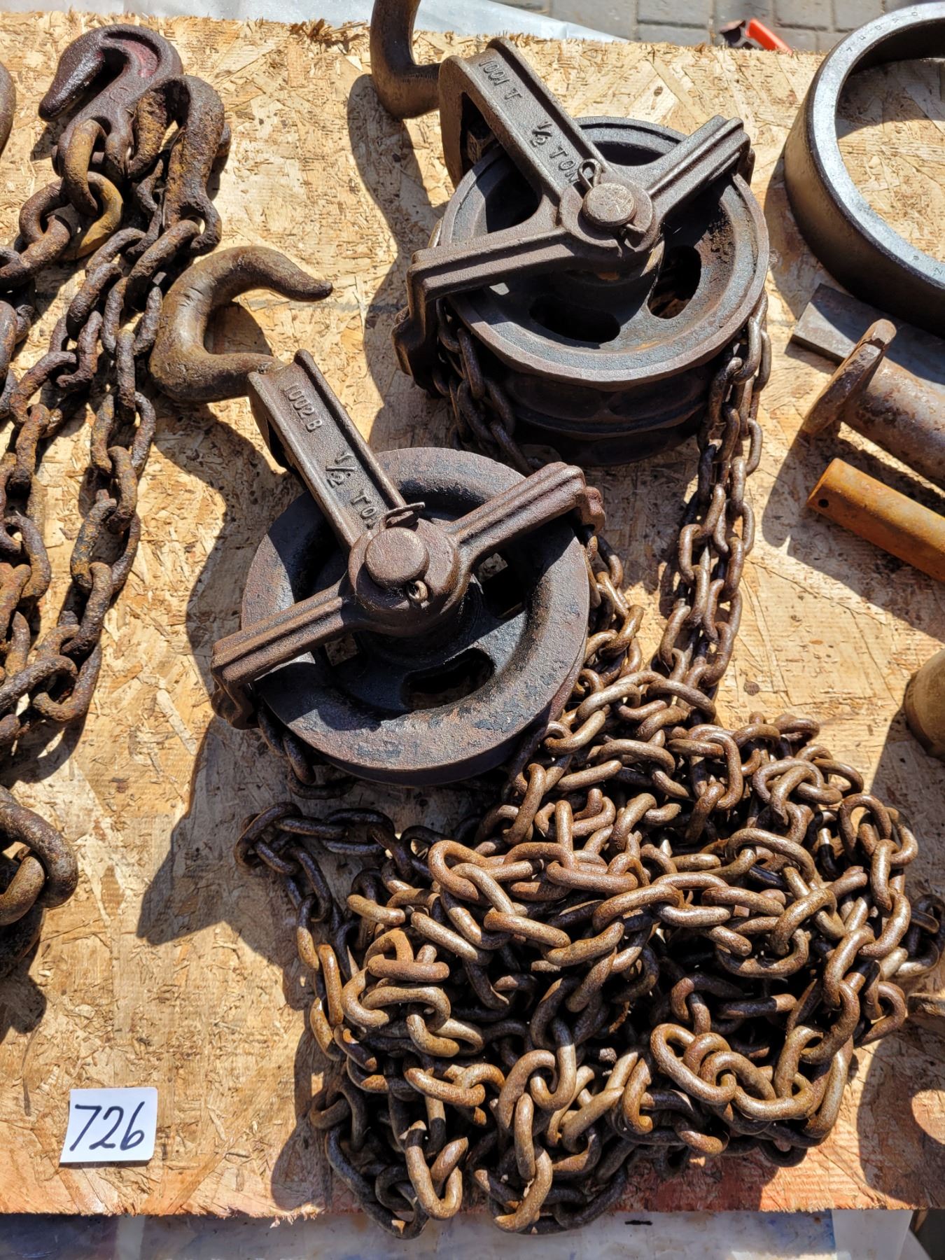 1/2 ton chain hoist, misc chains, clevis, draw pin & solid steel ring.
