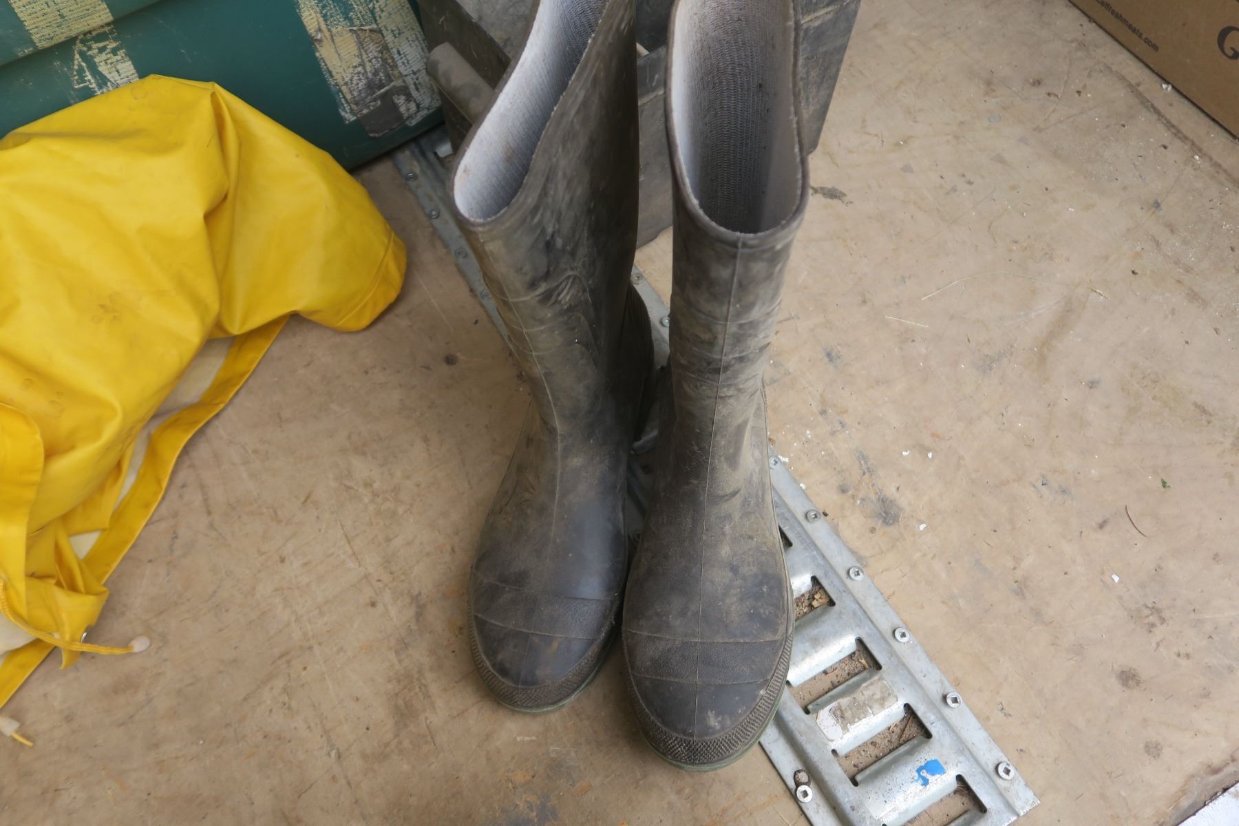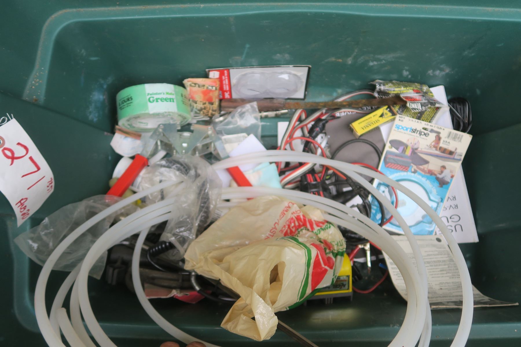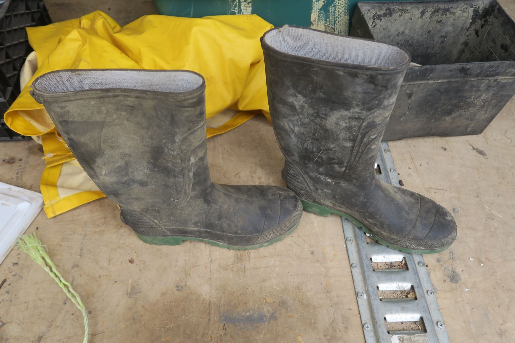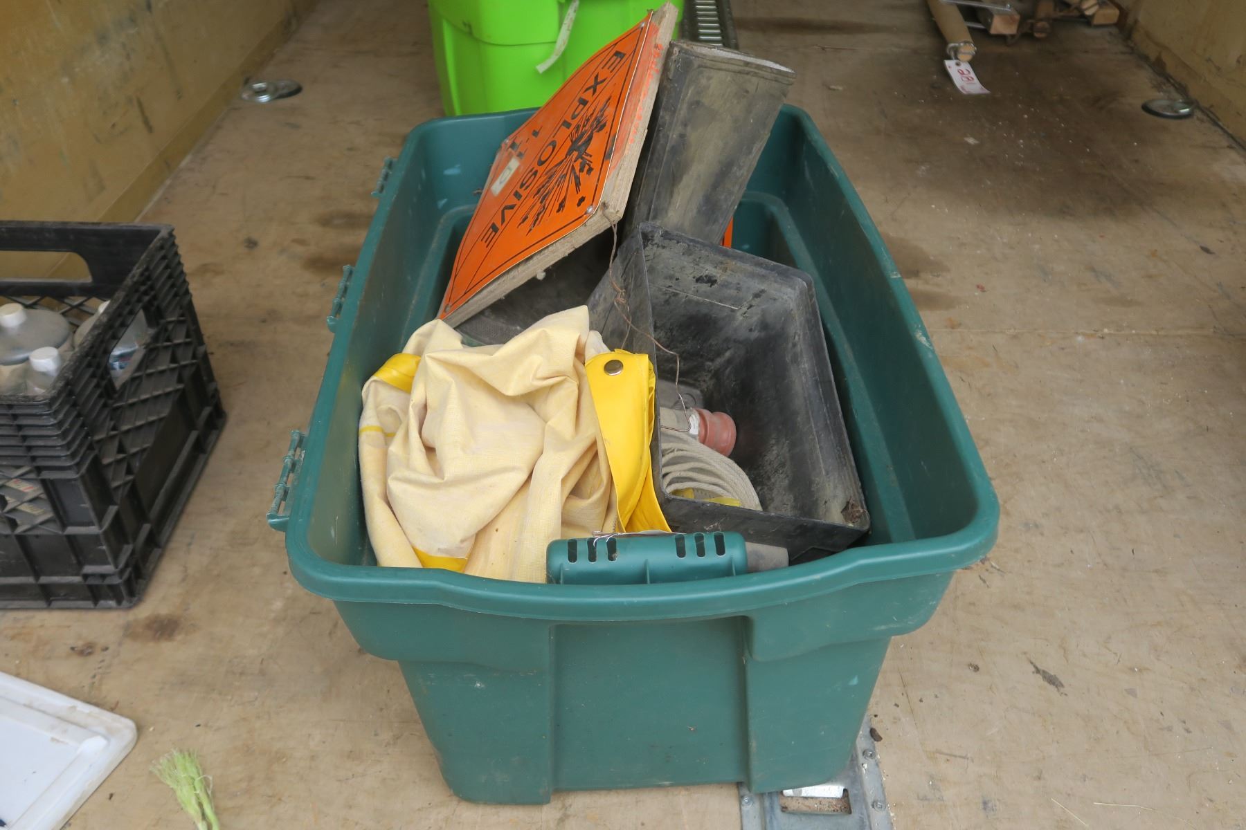 1 Dark green tote of misc items. Rain boots size 12, rain coat, varous hardware.