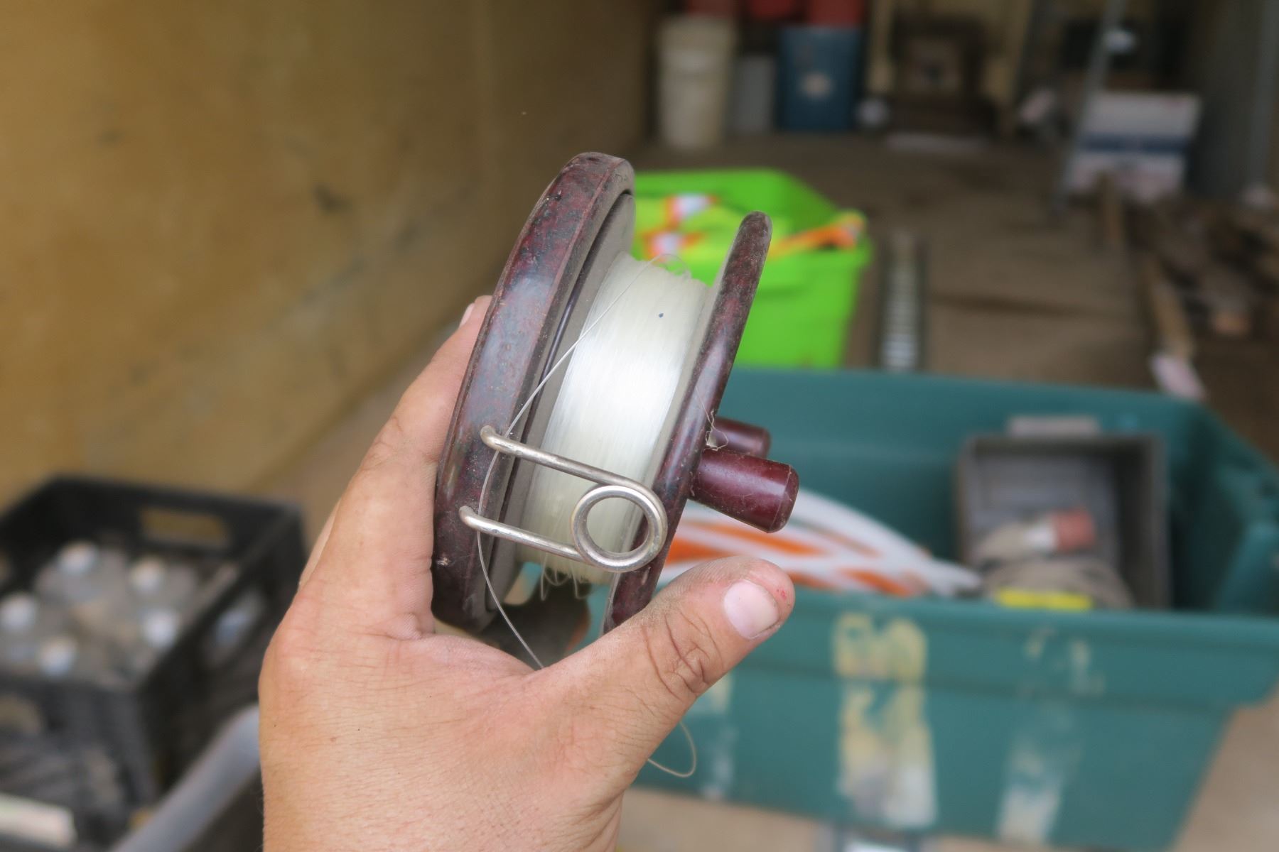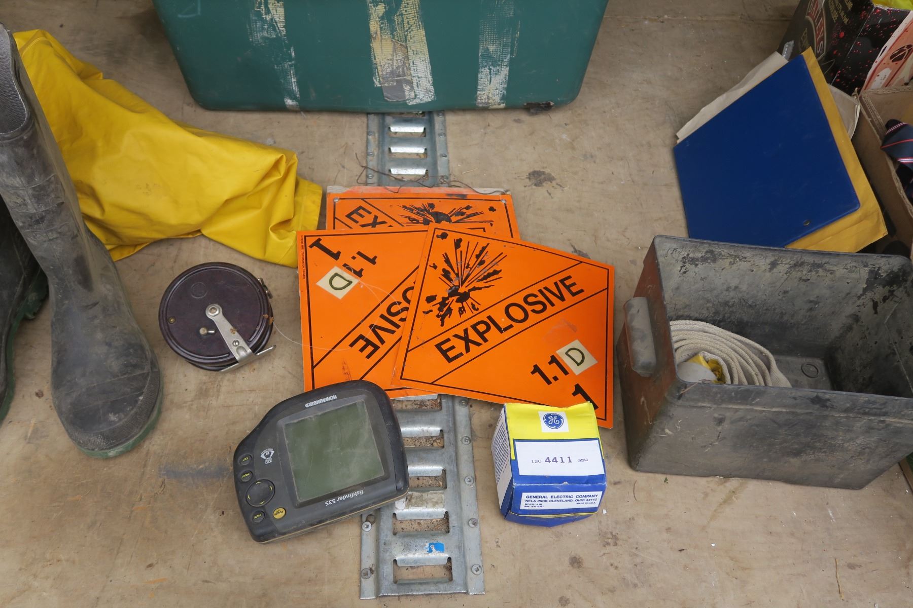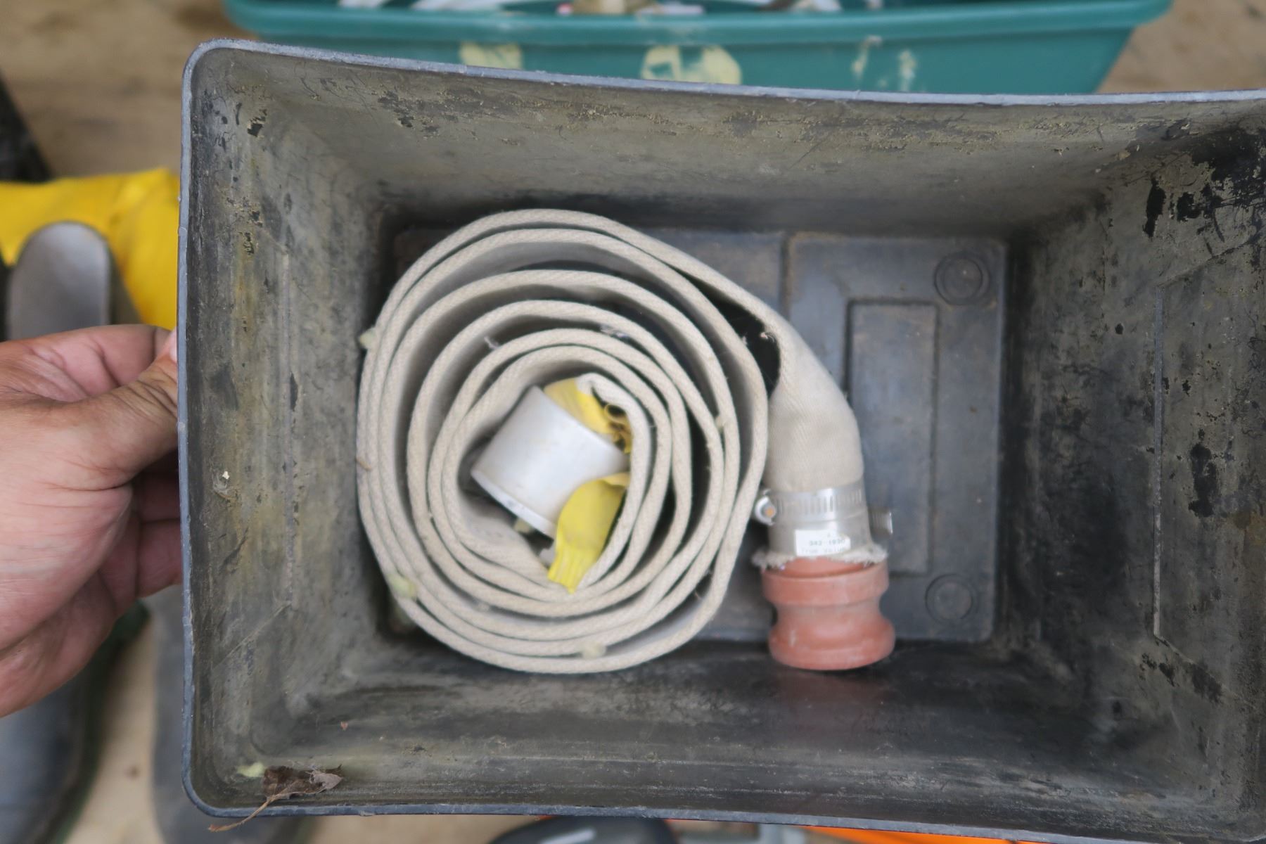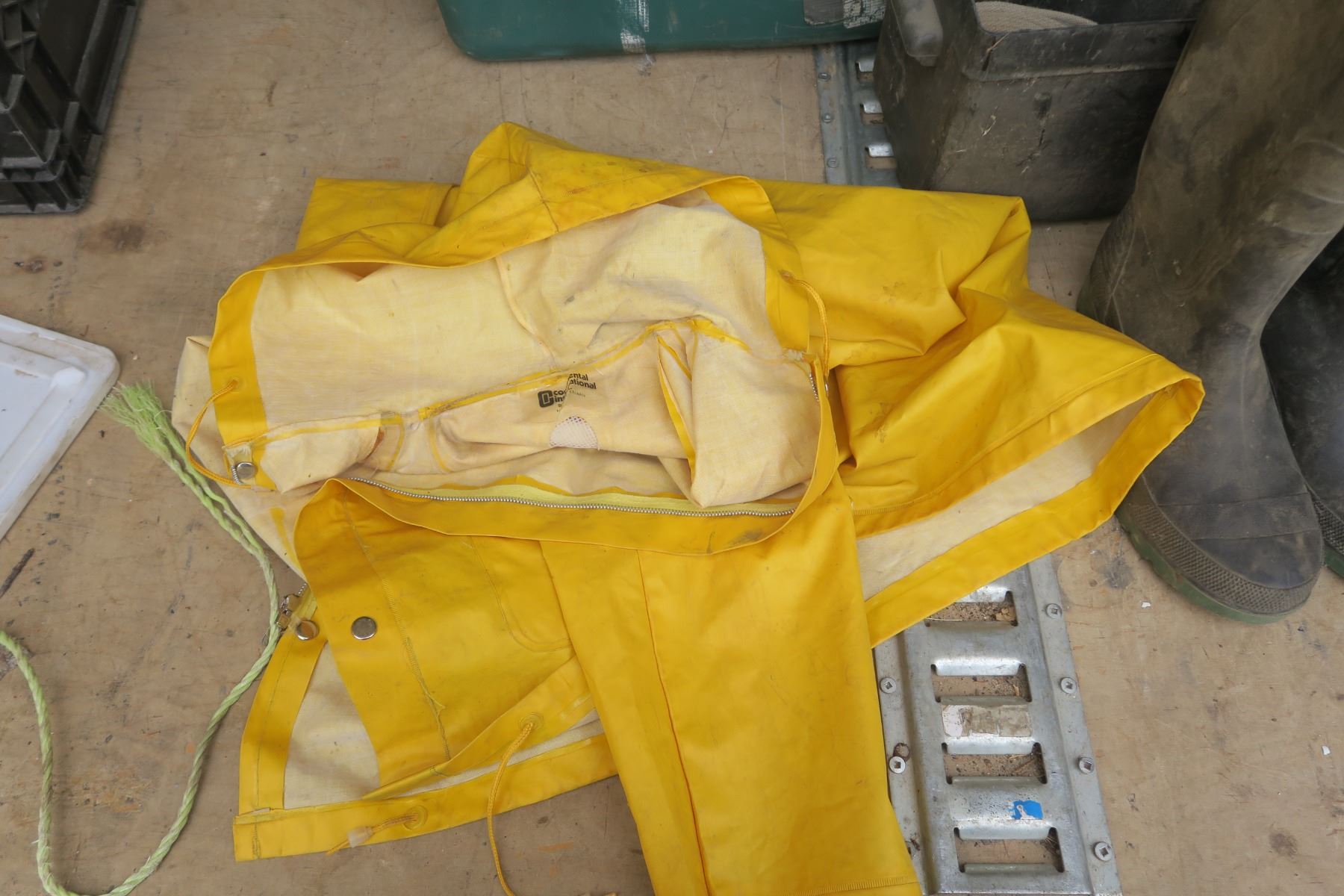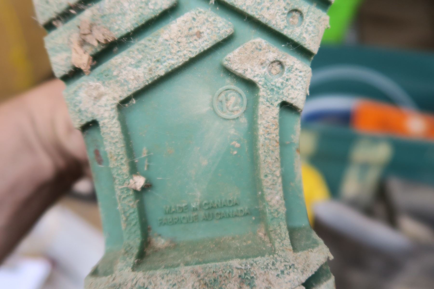1 Dark green tote of misc items. Rain boots size 12, rain coat, varous hardware.