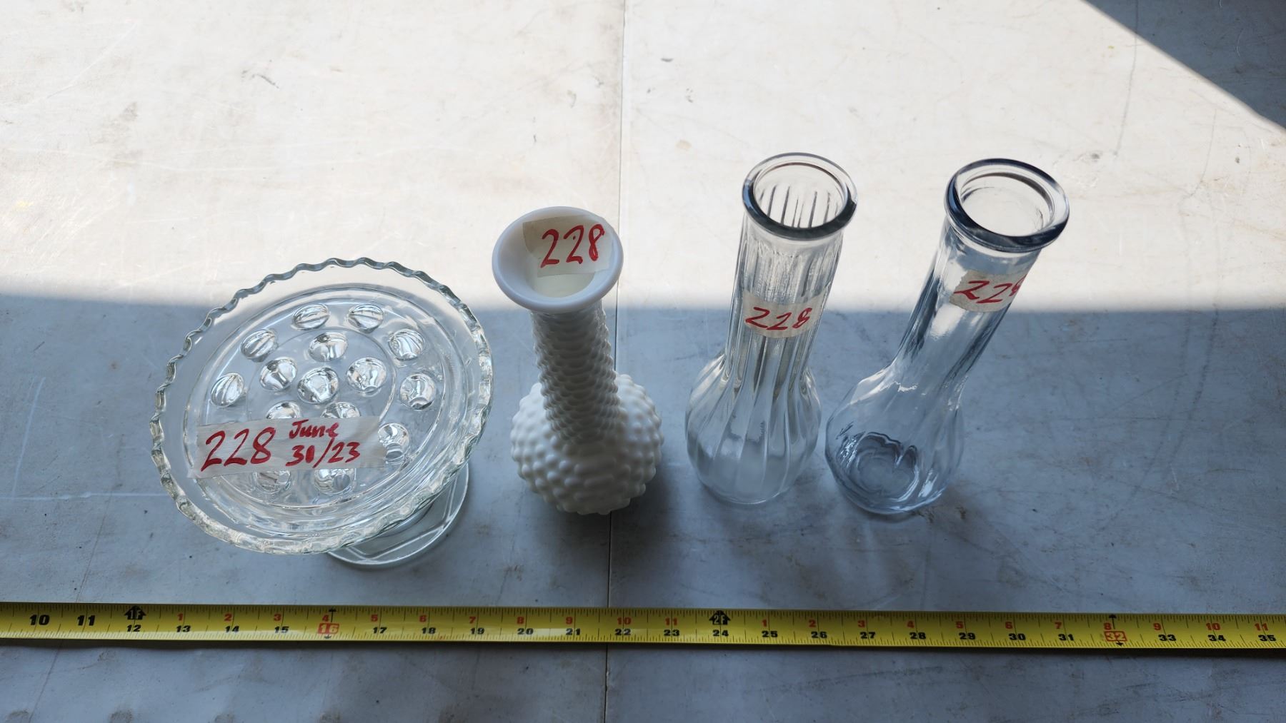 1 Hobnail Milk Glass vase + 2 glass vases, + Cut Glass Bowl