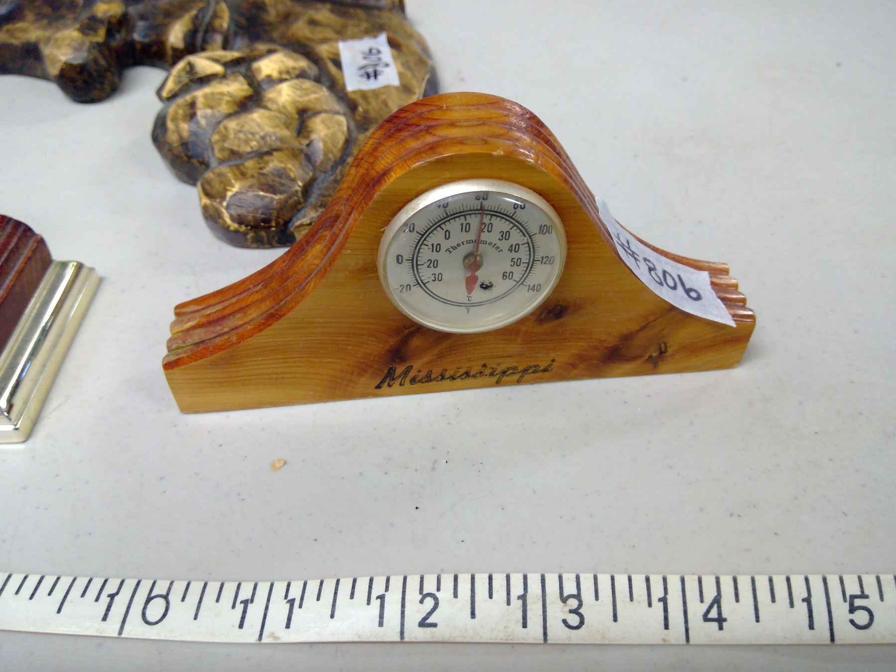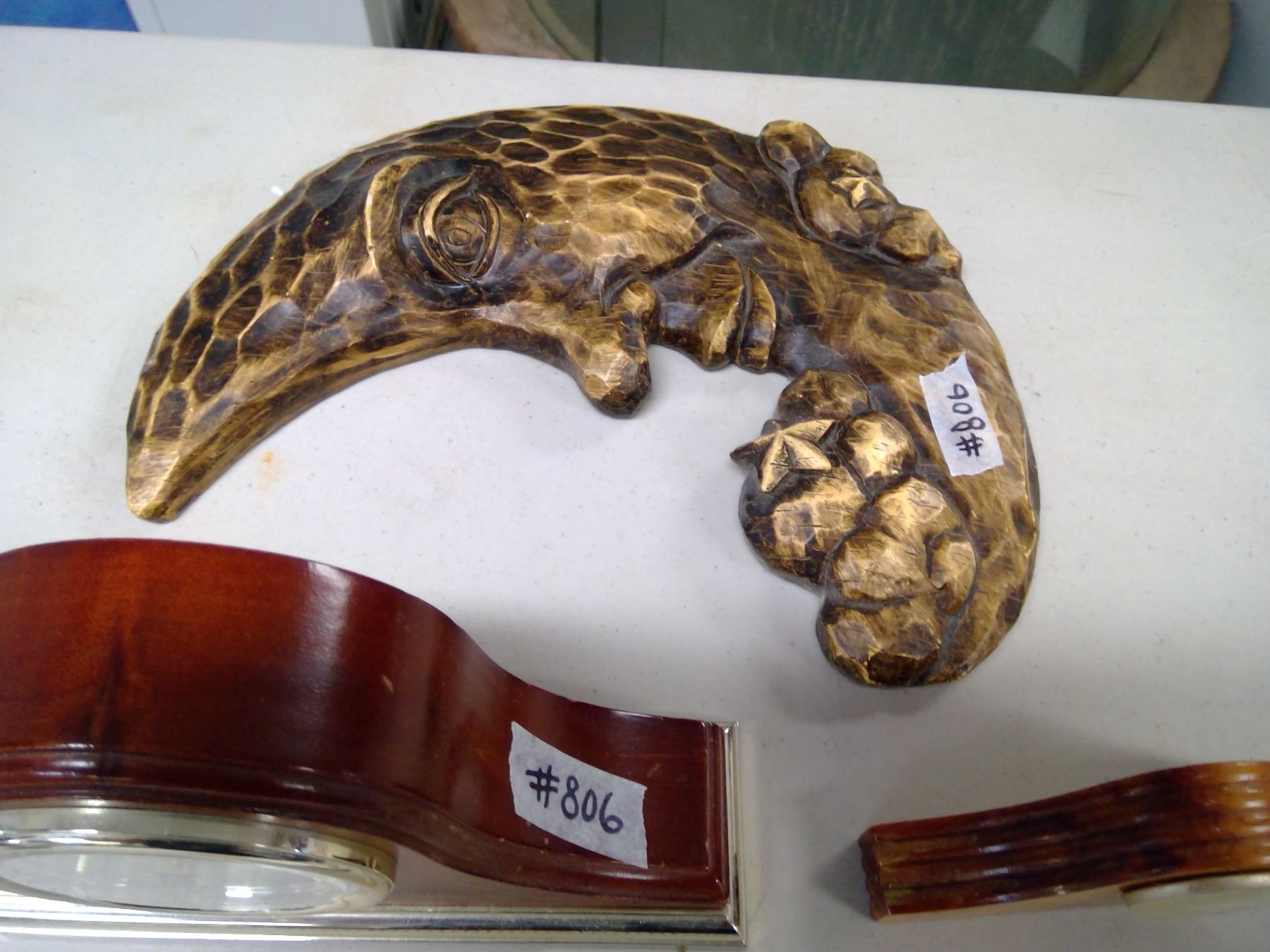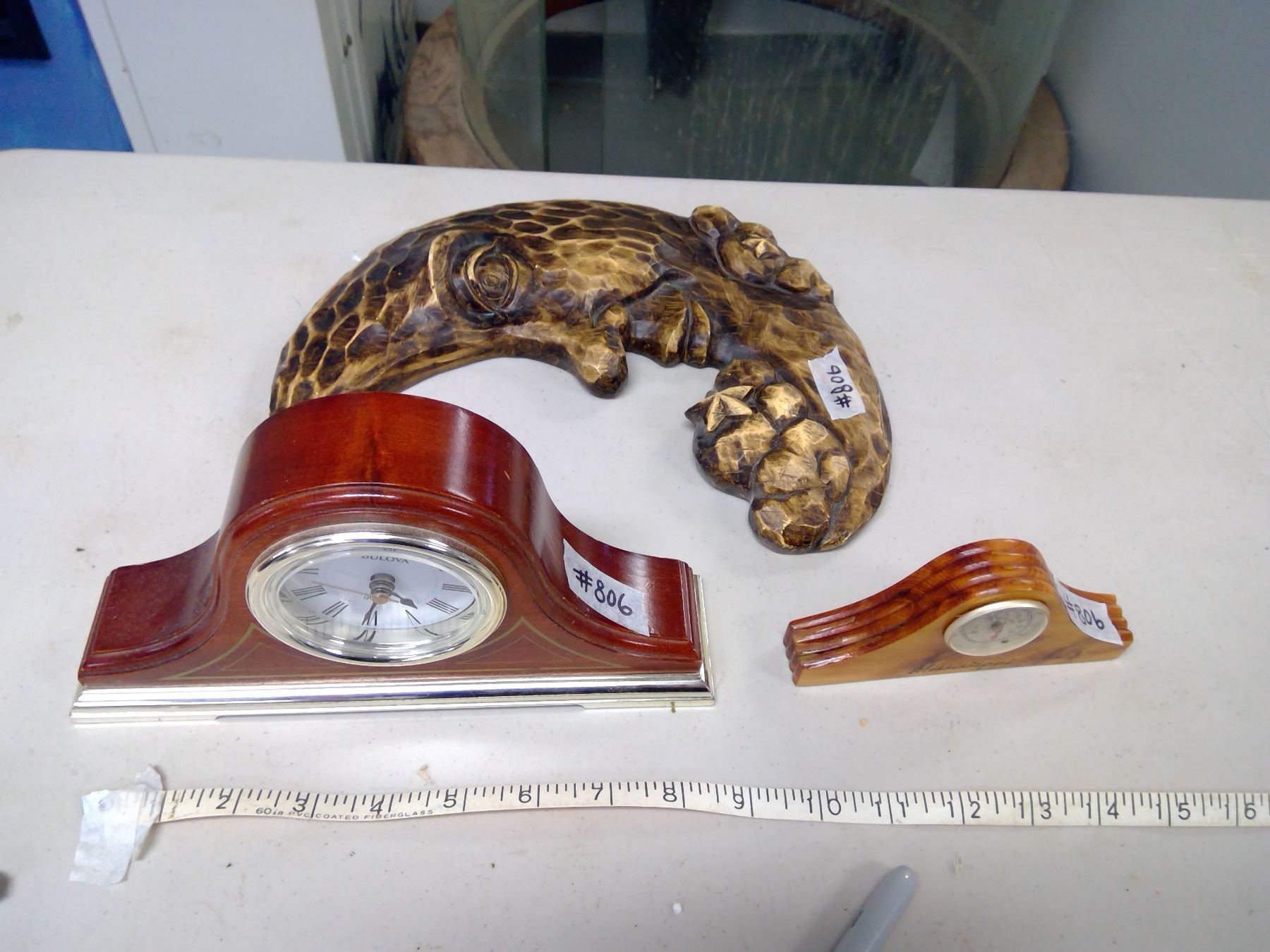 1 MANTLE CLOCK, 1 MANTLE THERMOMETER, AND MOON DECORATION