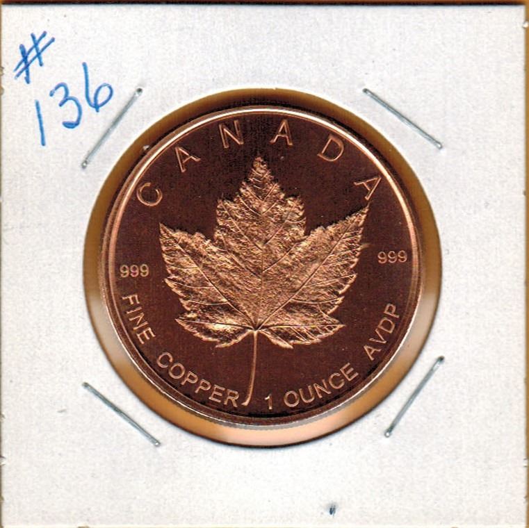 1 OUNCE COPPER .999 FINE - CANADA - MAPLE LEAF