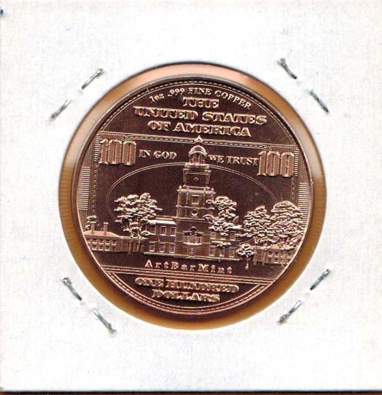 1 OUNCE COPPER - .999 FINE - US $100.00 BANKNOTE DESIGN