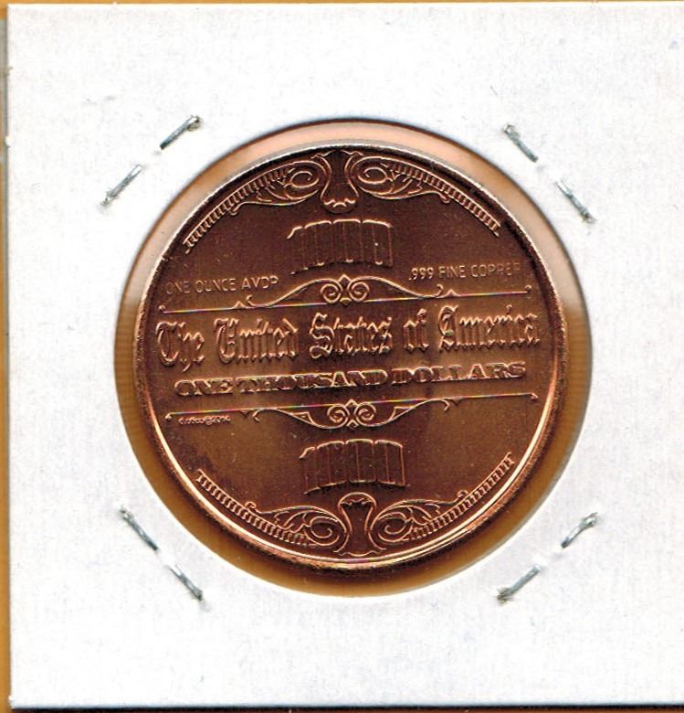 1 OUNCE COPPER - .999 FINE - US $1000.00 BANKNOTE DESIGN
