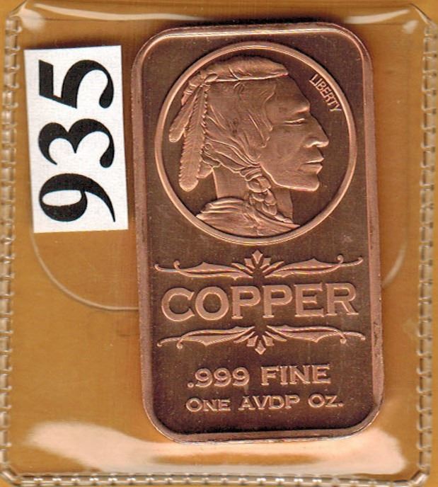 1 OUNCE COPPER BAR .999 FINE - INDIAN HEAD DESIGN