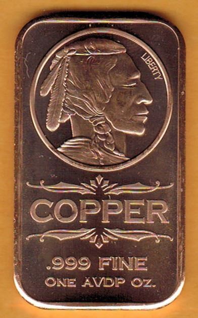 1 OUNCE COPPER BAR - .999 FINE - INDIAN HEAD DESIGN