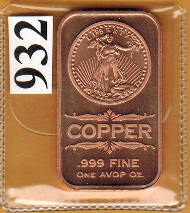 1 OUNCE COPPER BAR .999 FINE - ST. GAUDENS DESIGN