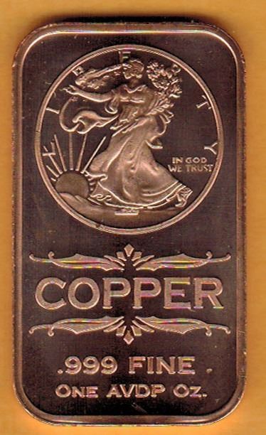 1 OUNCE COPPER BAR - .999 FINE - WALKING LIBERTY COIN DESIGN