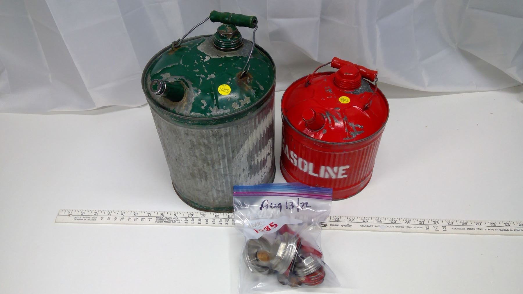1 gallon red gasoline pail – GW metal products Winnipeg, clean inside 1940’s, 1 green gasoline pail – GW metal products Winnipeg, clean inside, NOS/Used caps and gaskets for above gasoline pails