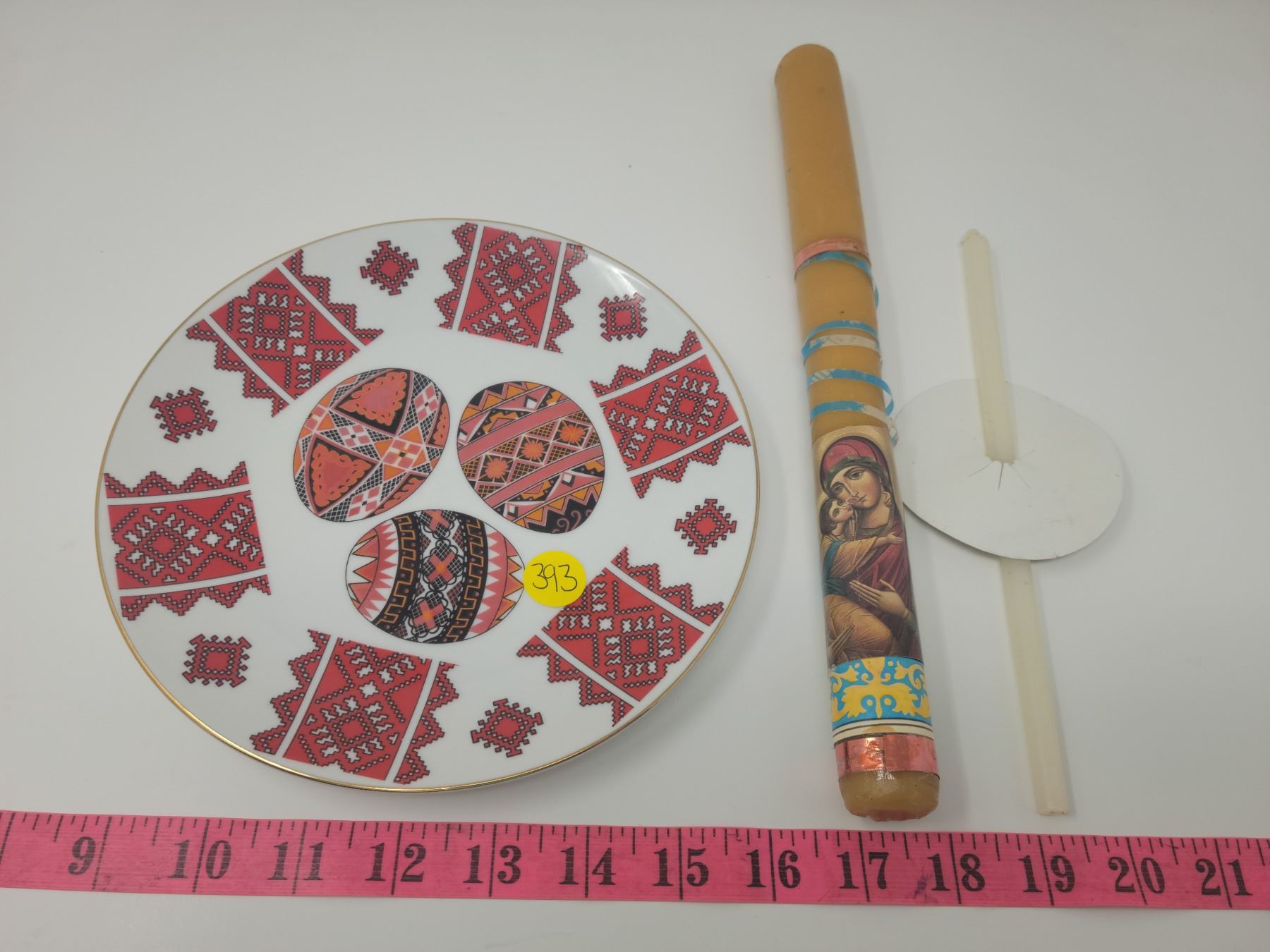 1 hand held and one decorative candle both from Ukraine & glass Ukrainian Easter Egg plate, 8" wide, Edelstein Bavaria Germany