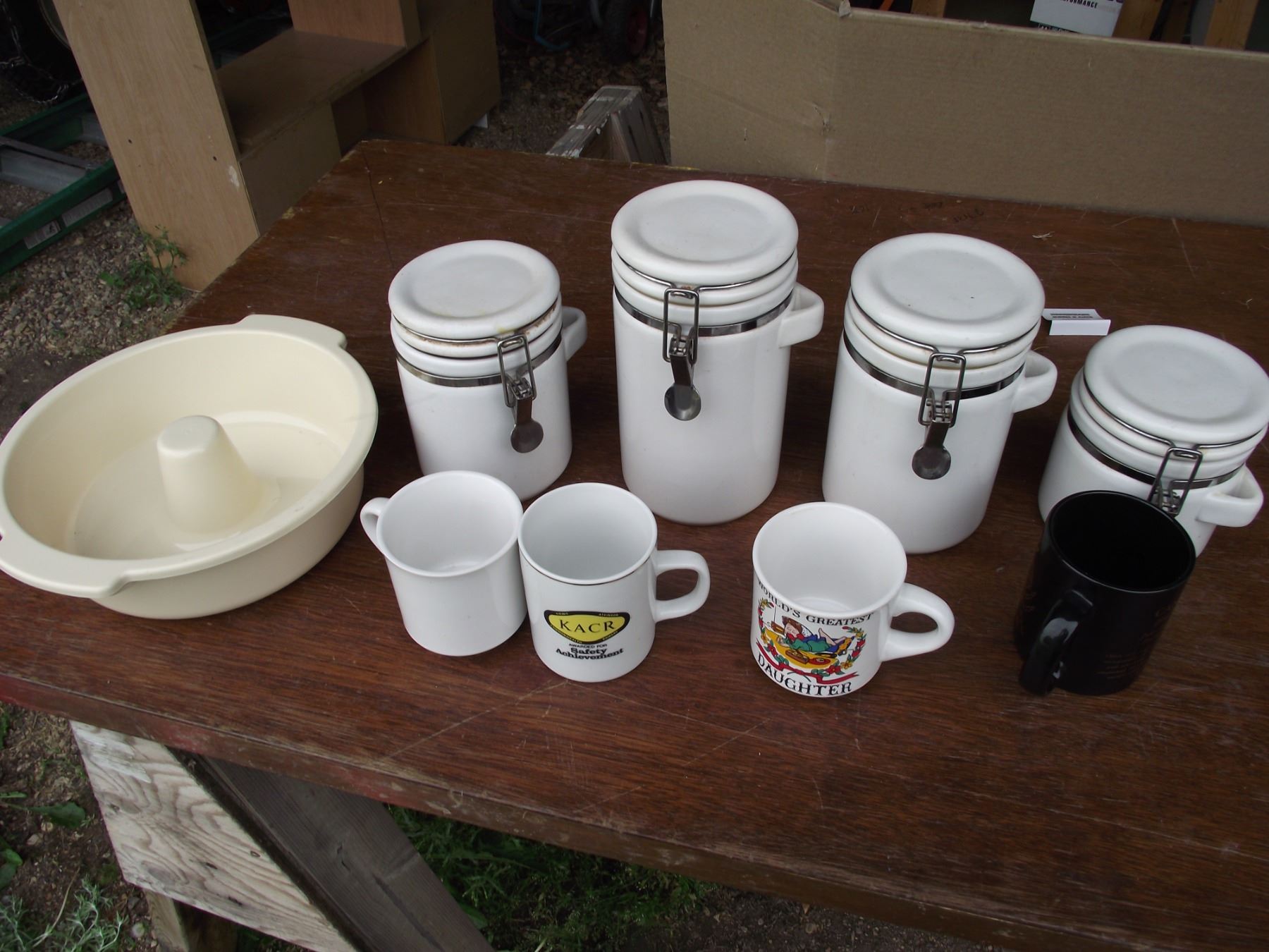 1- microwave dish, 4-Canisters, and 4 Coffee Mugs.