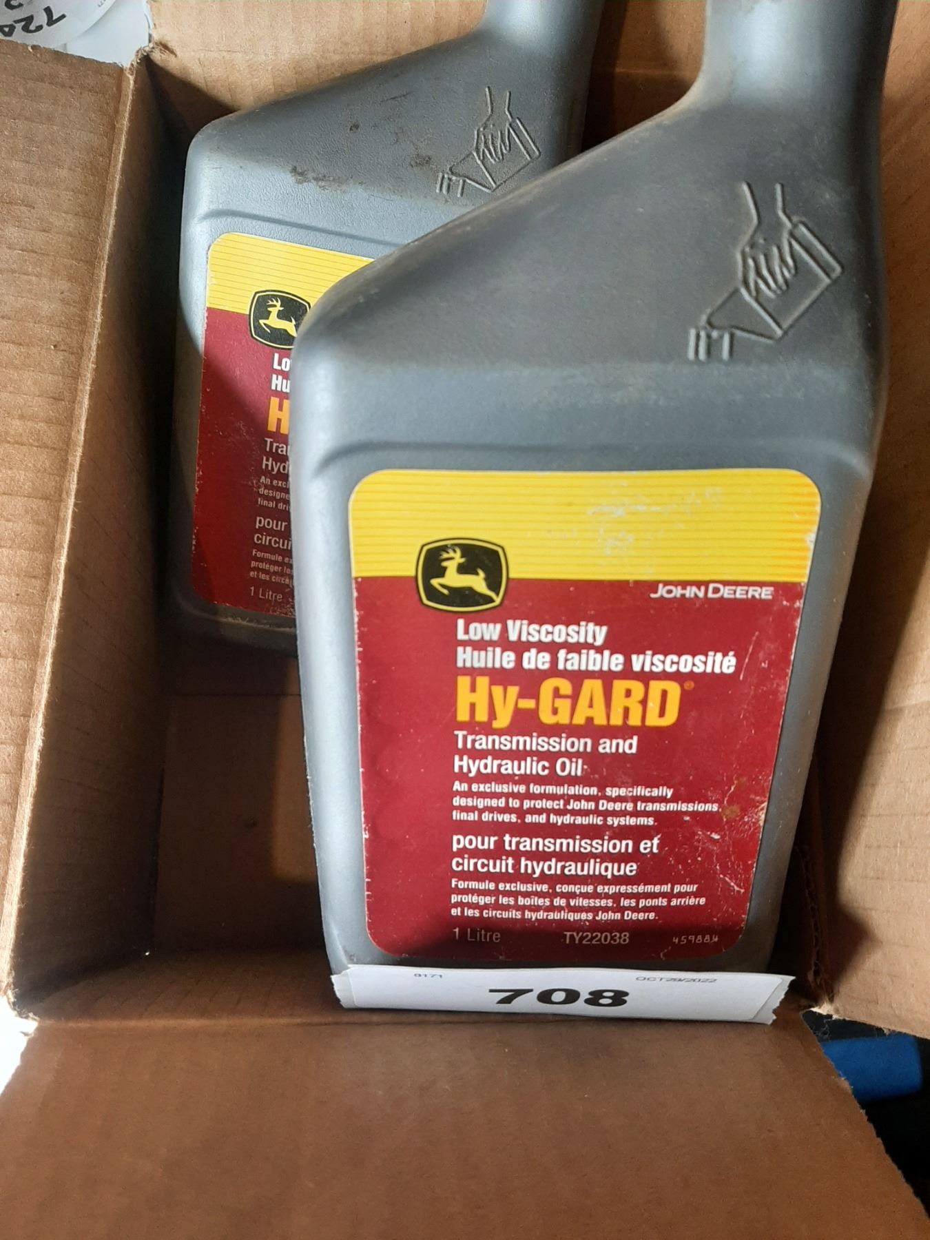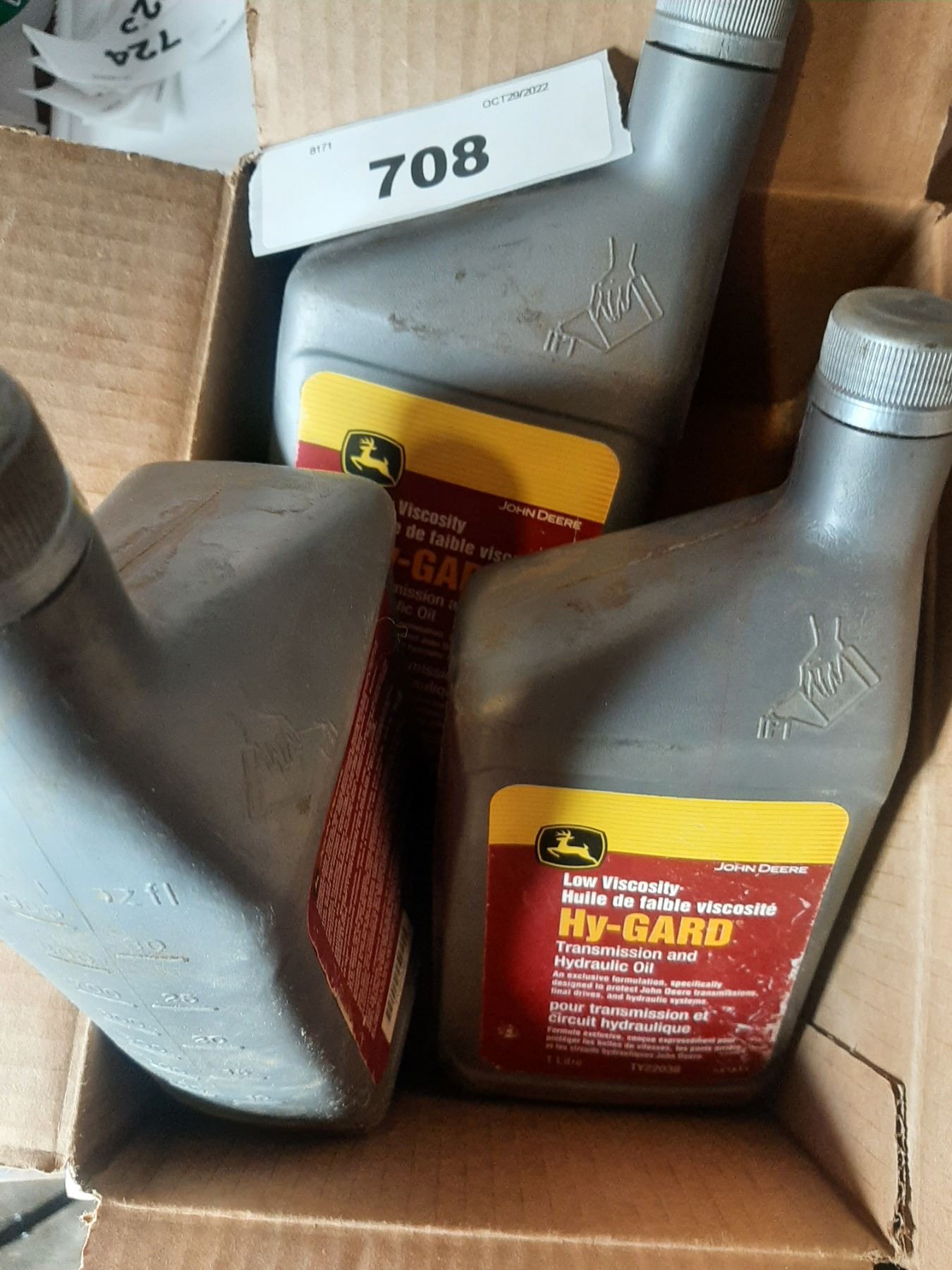 1 opened and 2 unopened JD Hy-Gard hydraulic oil