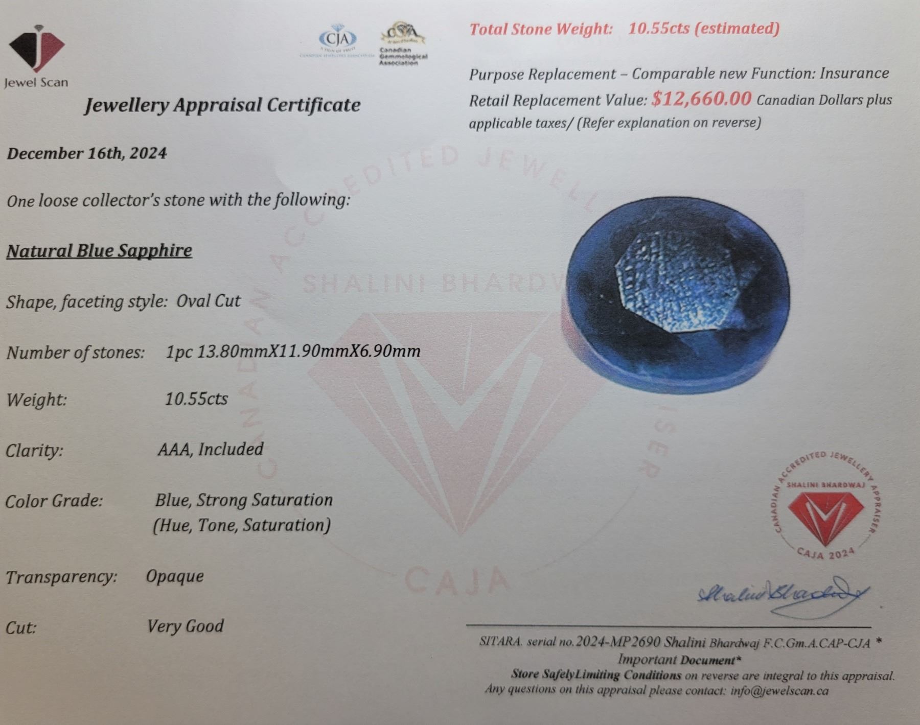 10.55 ct Certified Blue Sapphire gemstone ($12,660 Appraisal)
