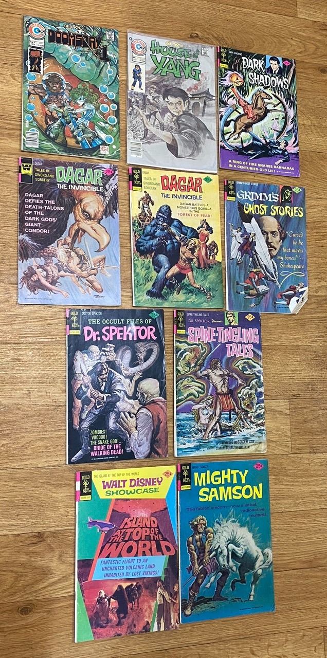 10 Comics 25 Cents - Carlton, Gold Key: Doomsday, Dark Shadows, Dagar, Grimm’s Ghost Stories, Dr. Spektor, Walt Disney Showcase, Mighty Samson