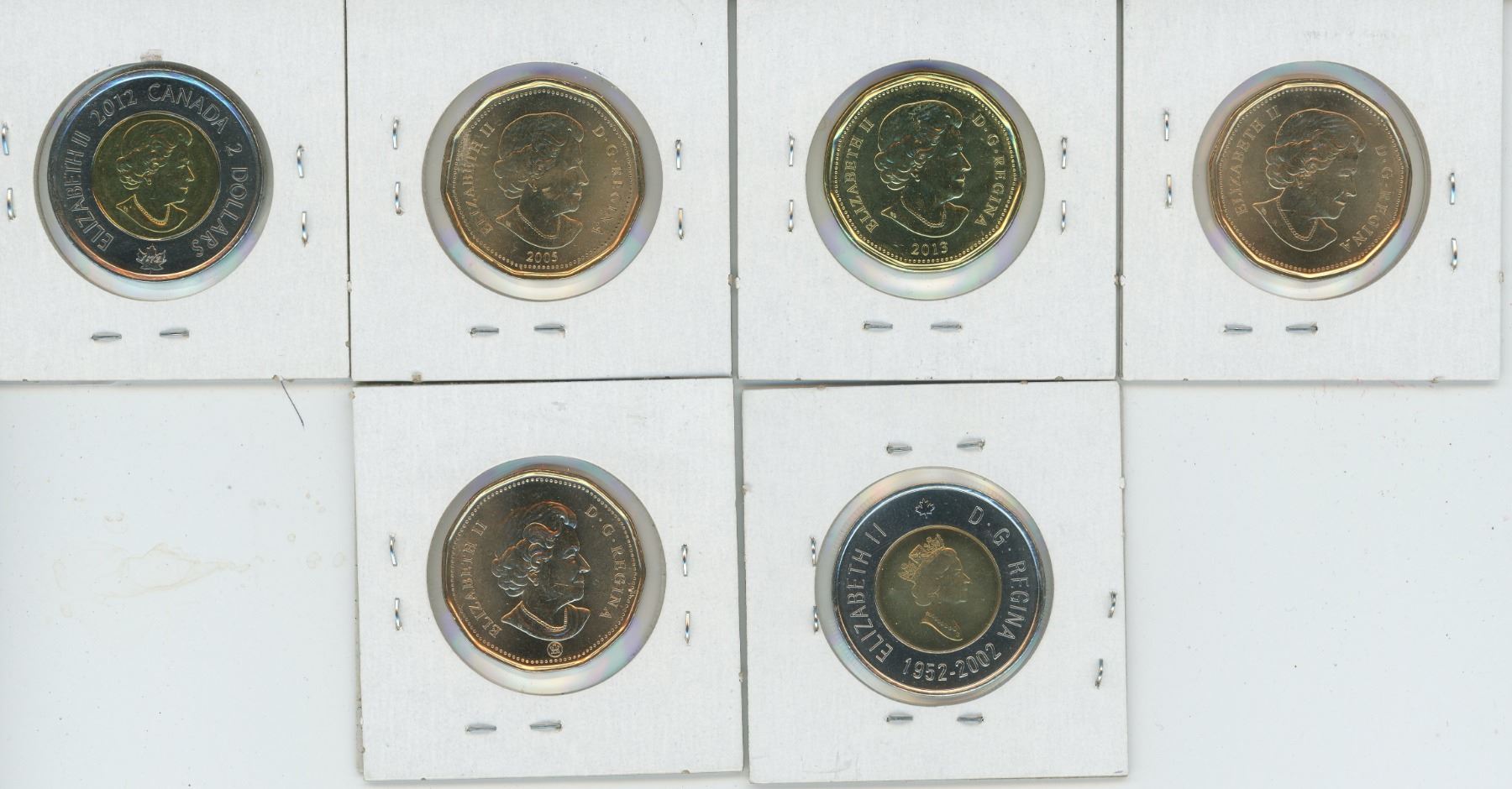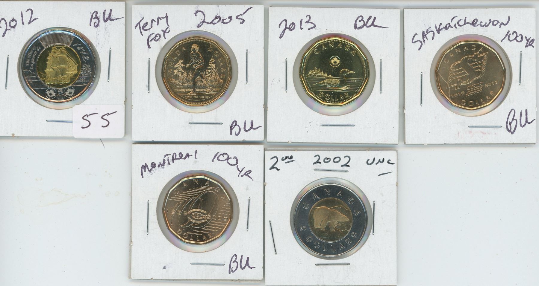 100 Year Saskatchewan, 2005 Fox, 2013 $1.00, 2002 Toonie, 2012 Toonie, 100 Year Loonie (All BU)