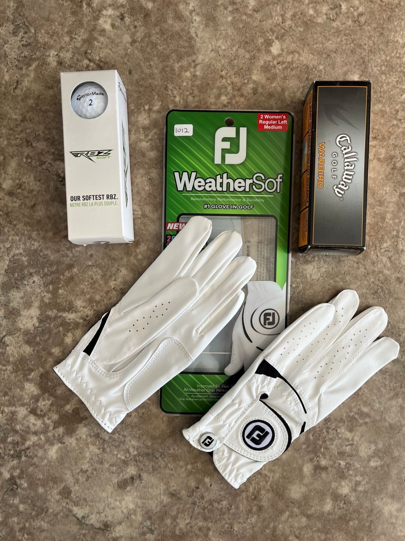 1012 - Women’s golf gloves (for left hand). New. Never used. (2 pair -size medium). With 2 sleeves of balls.