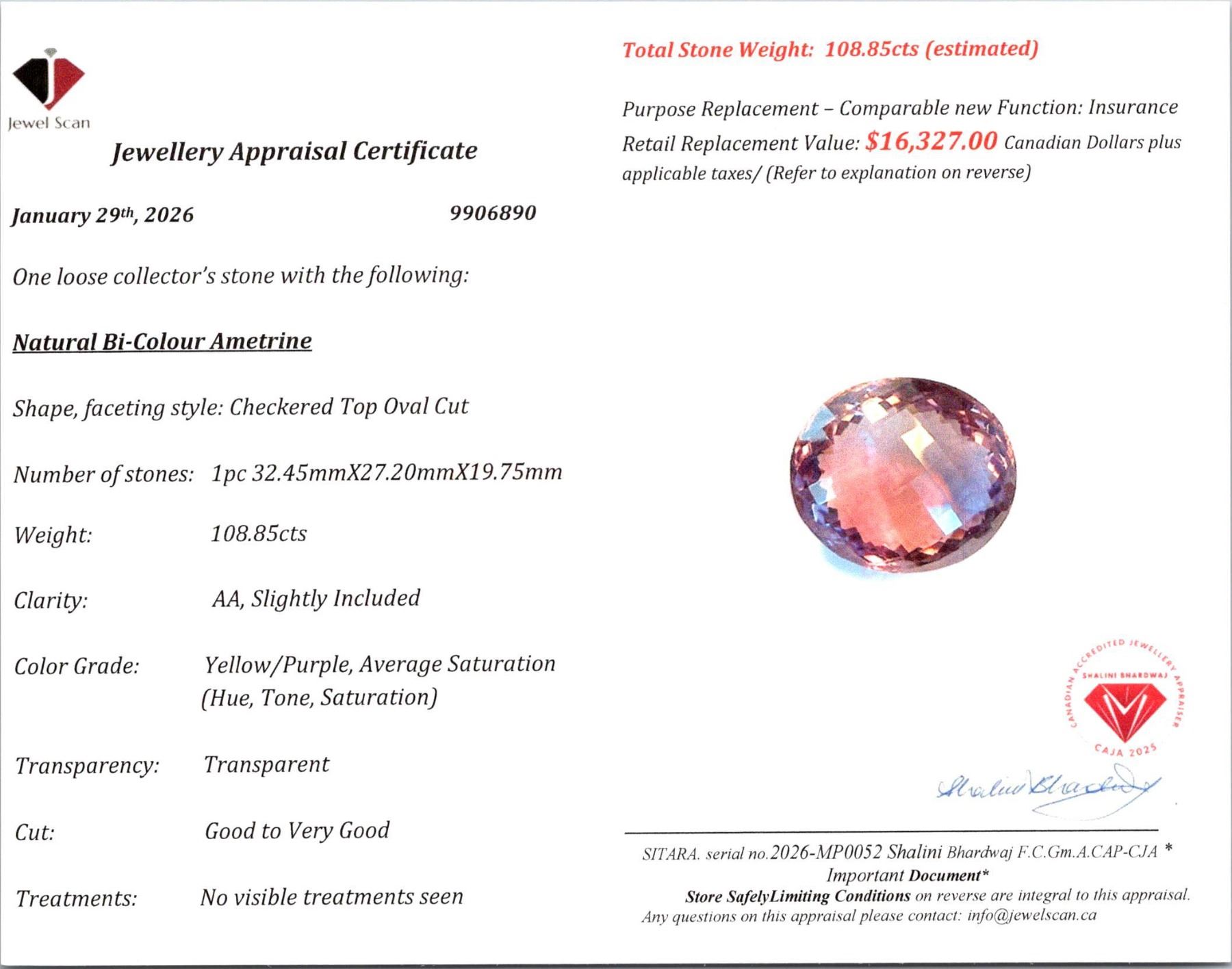 108.85 ct Certified Bi-Colour Ametrine gemstone ($16,327 Appraisal)