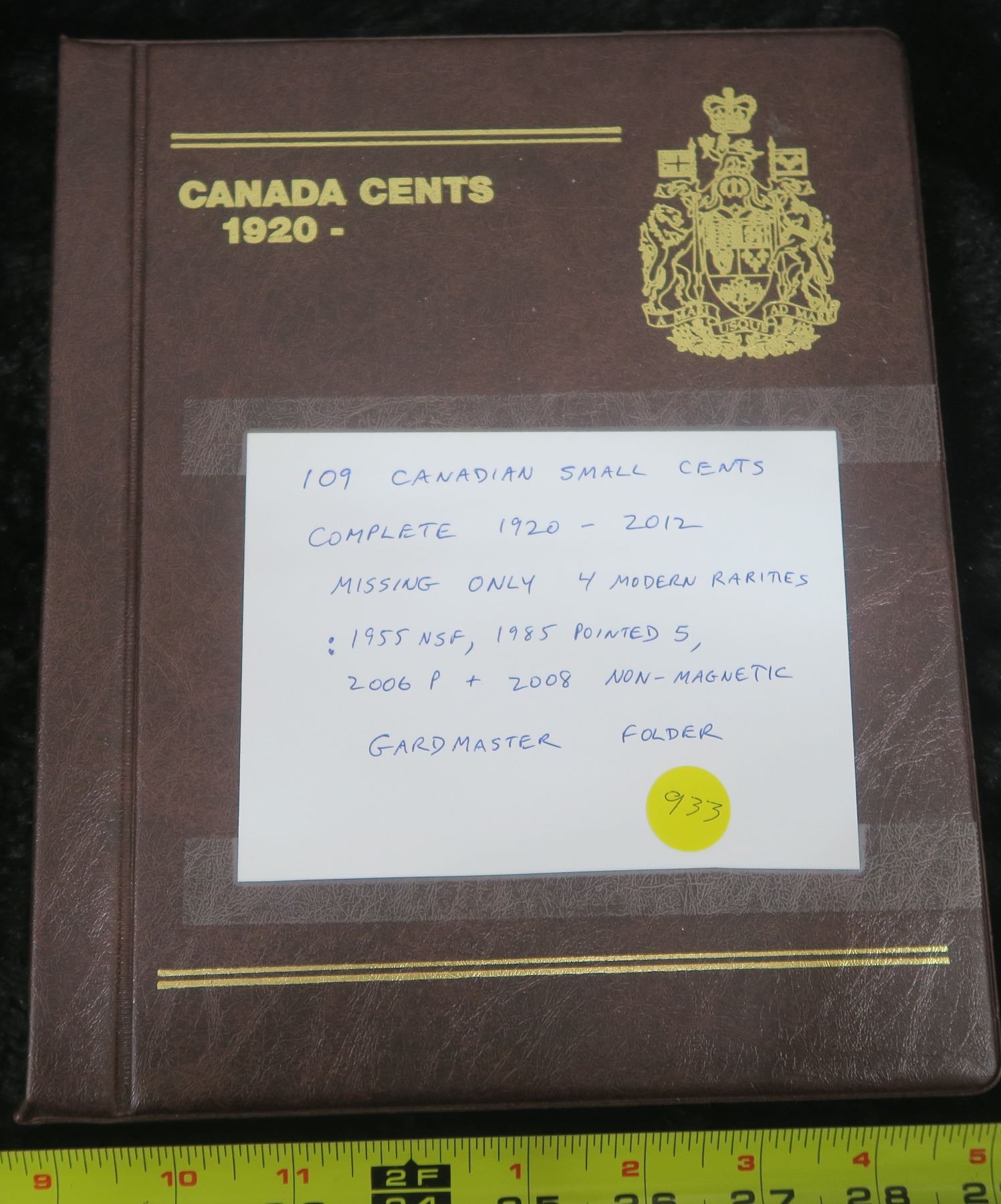 109 Canadian Small Cents Collection. Complete 1920 to 2012. Includes Key Dates like 1922 – 1926 but missing 4 modern Rarities: 1955 NSF, 1985 Pointed 5, 2006P & 2008 Non-Magnetic. Housed in a Gardmaster Folder. F-12 to BU Red. A nice collection.