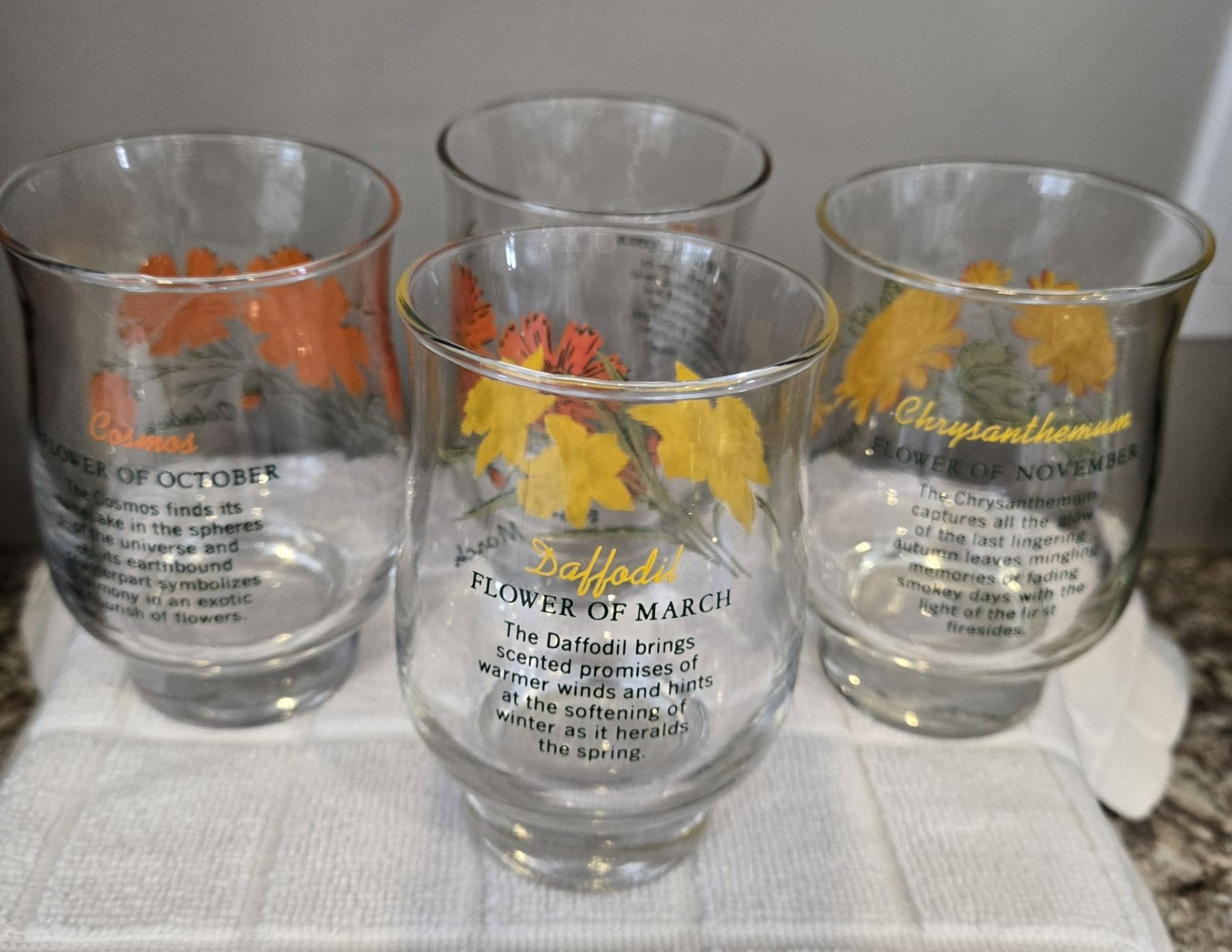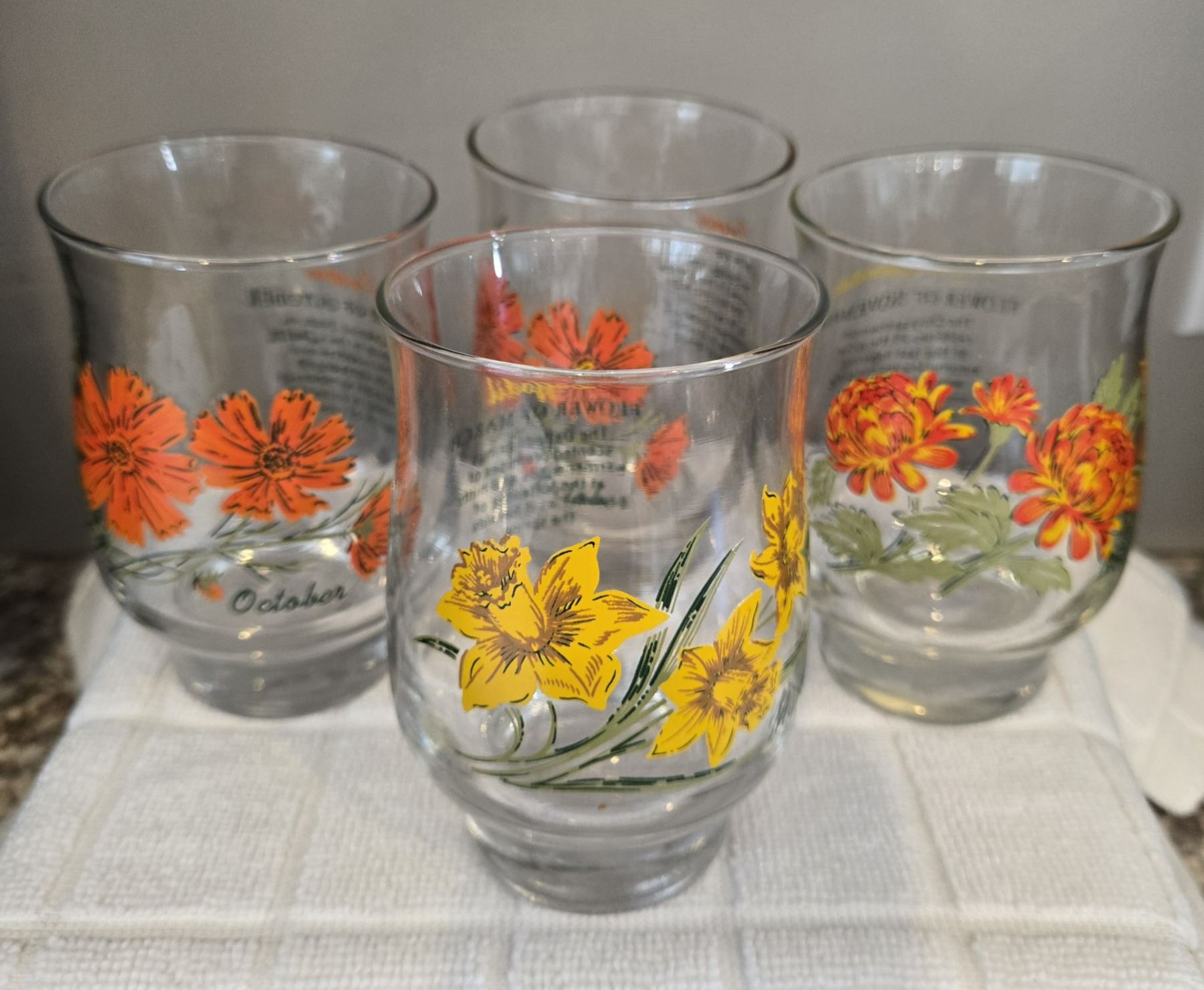 1097 - Lot of 4 vintage 1970s "Flower of the Month" drinking glasses produced by the Brockway Glass Company or Dominion Glass. 12 oz, 4 1/2" tall. One March, one November and two October.