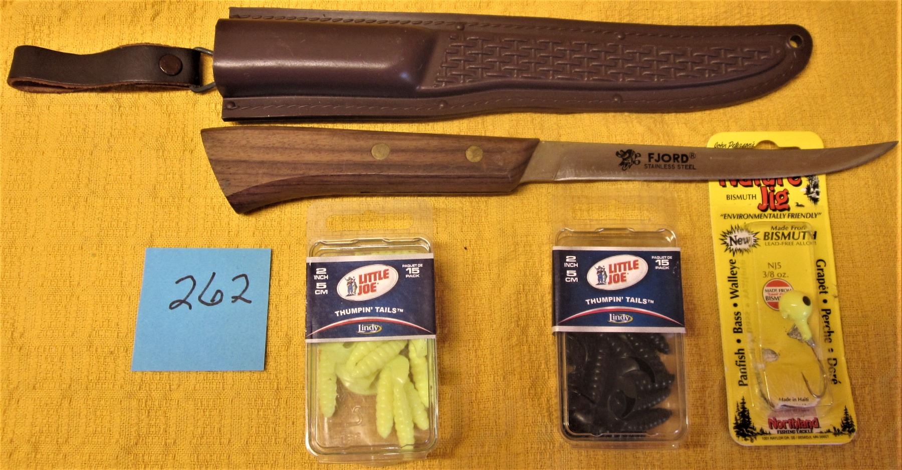 11" Fjord Filleting Knife/Sheath + 2 PKGS "Thumping Tail" Bait