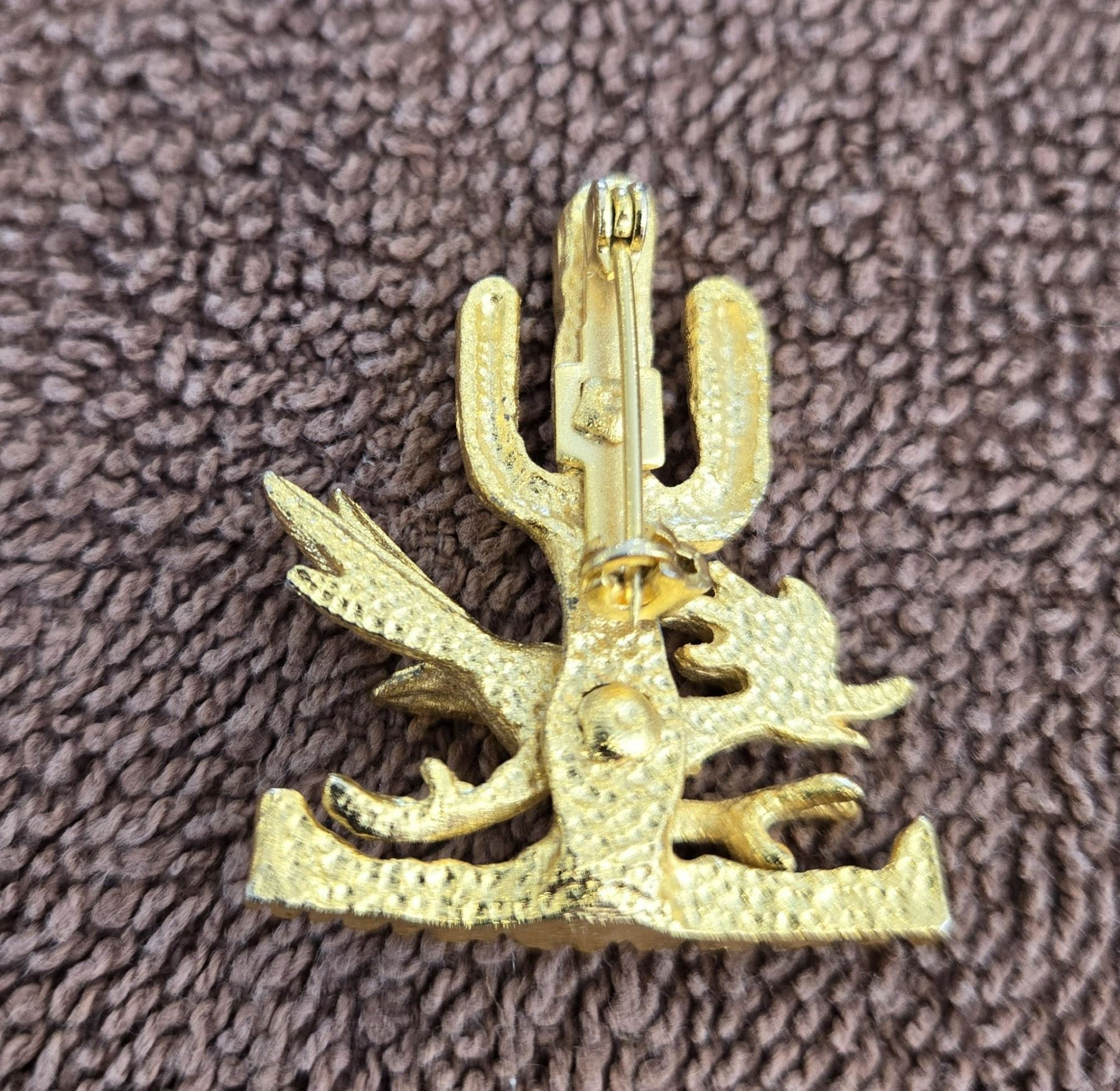 1102 - Vintage roadrunner shaped brooch. Gold tone metal with small gemstone eye. 1 1/2" tall.