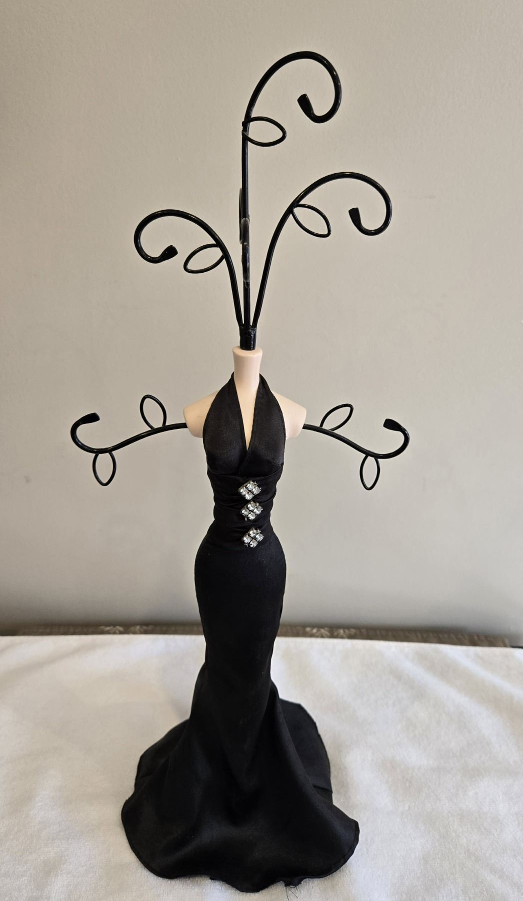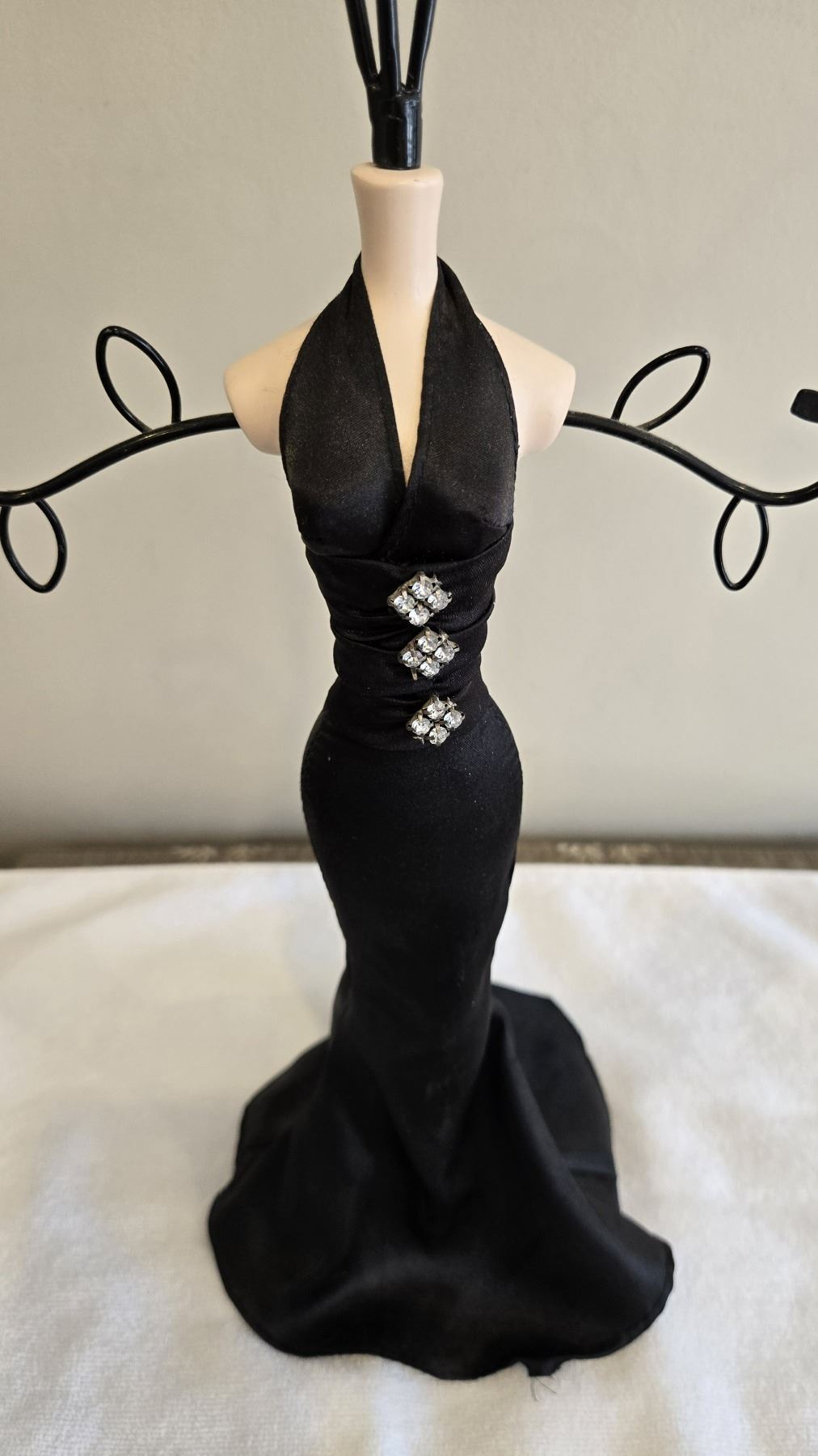 1103 - Vintage jewelery holder - manequin in black satin dress. 18" tall