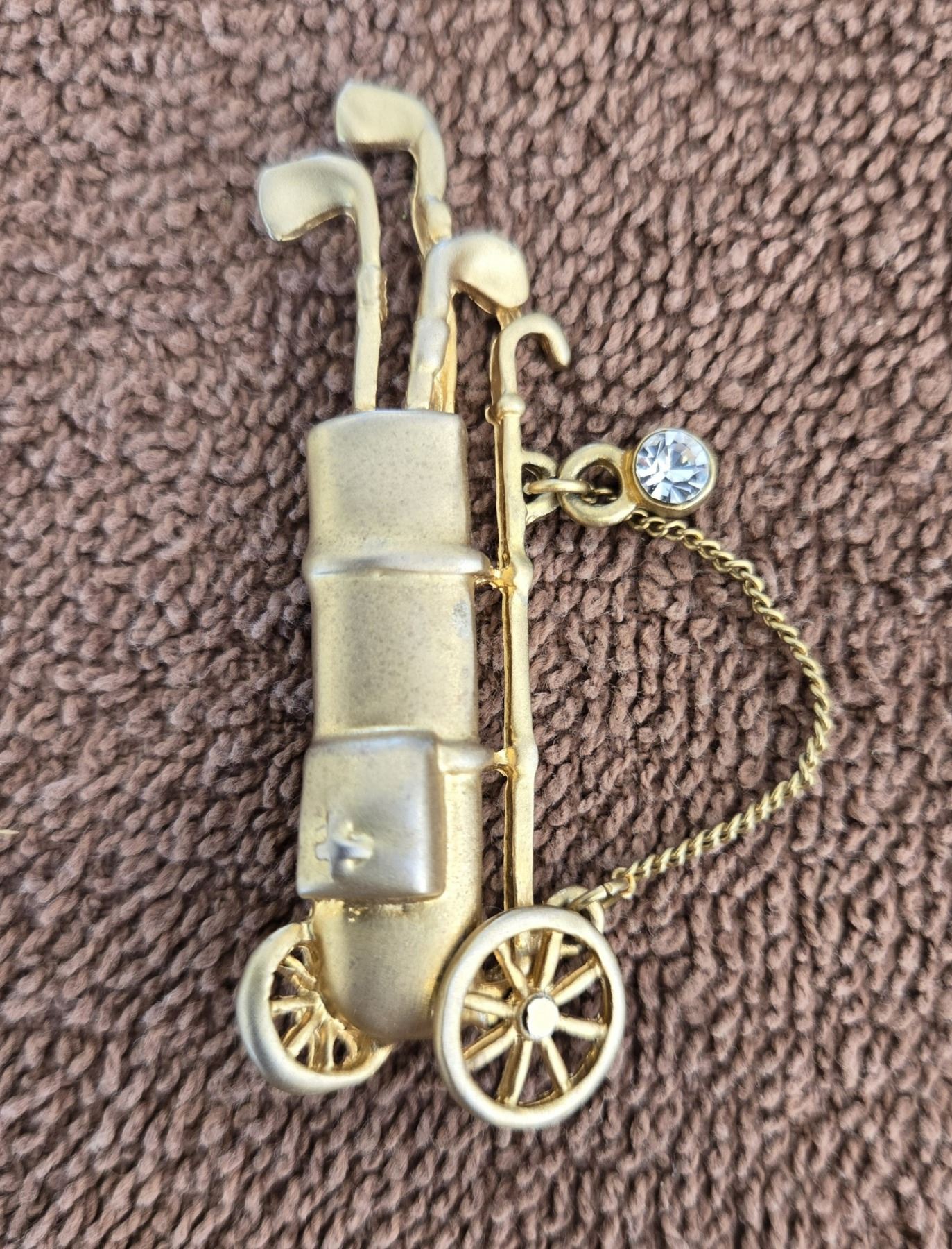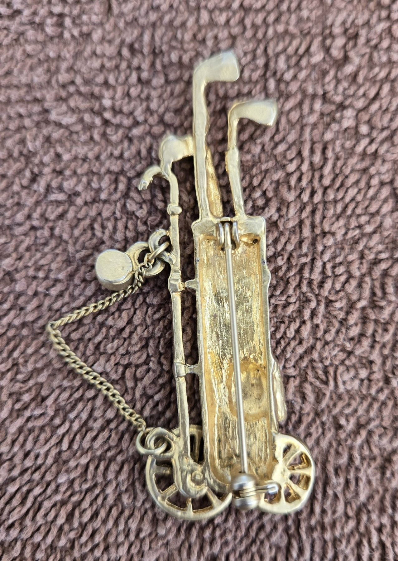 1104 - Vintage gold tone metal brooch shaped like a golf bag and clubs. Working wheel that spins, dangling chain with rhinestone charm. 2 1/2" tall