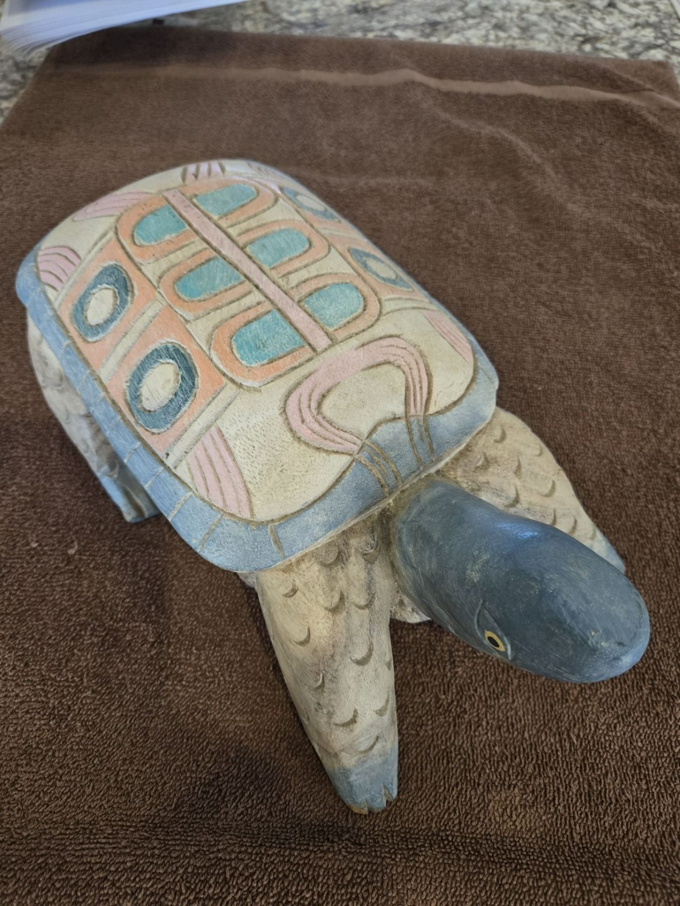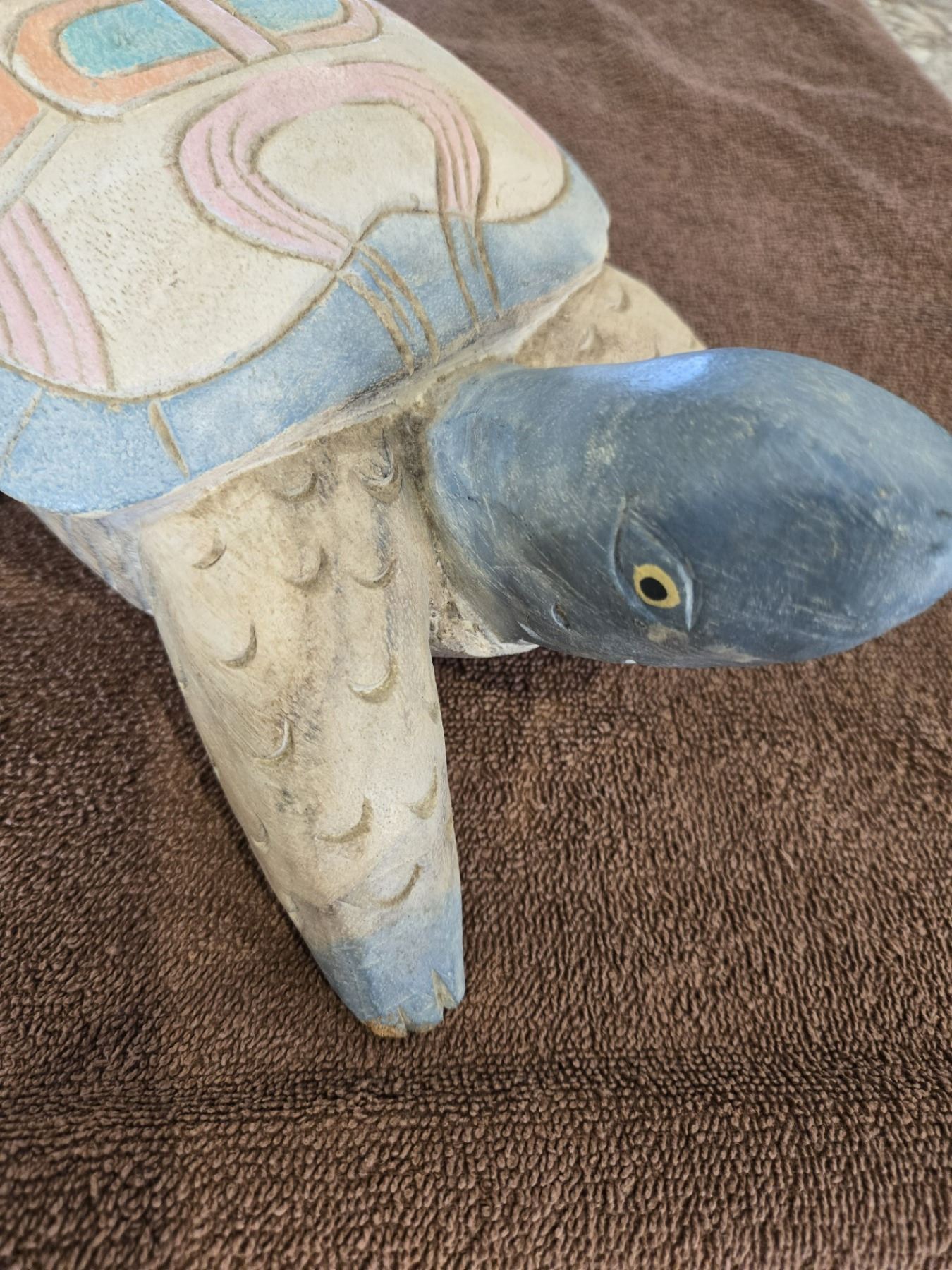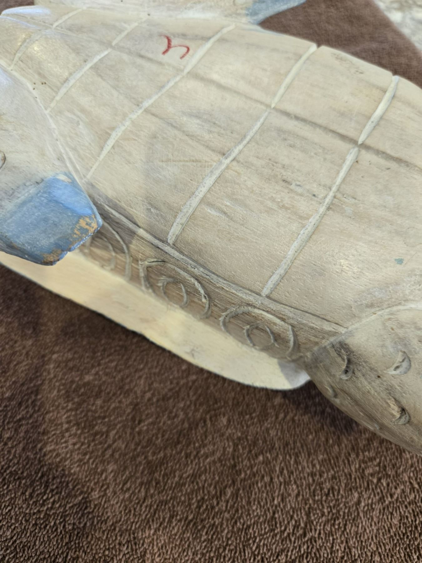 1106 - Hand carved and painted wooden sea tuetle sculpture. Painted details on the shell. 12" x 6".