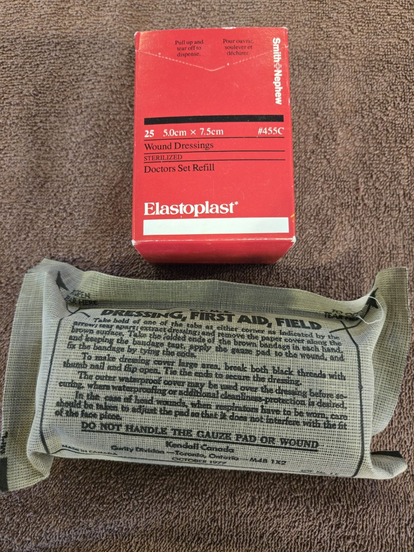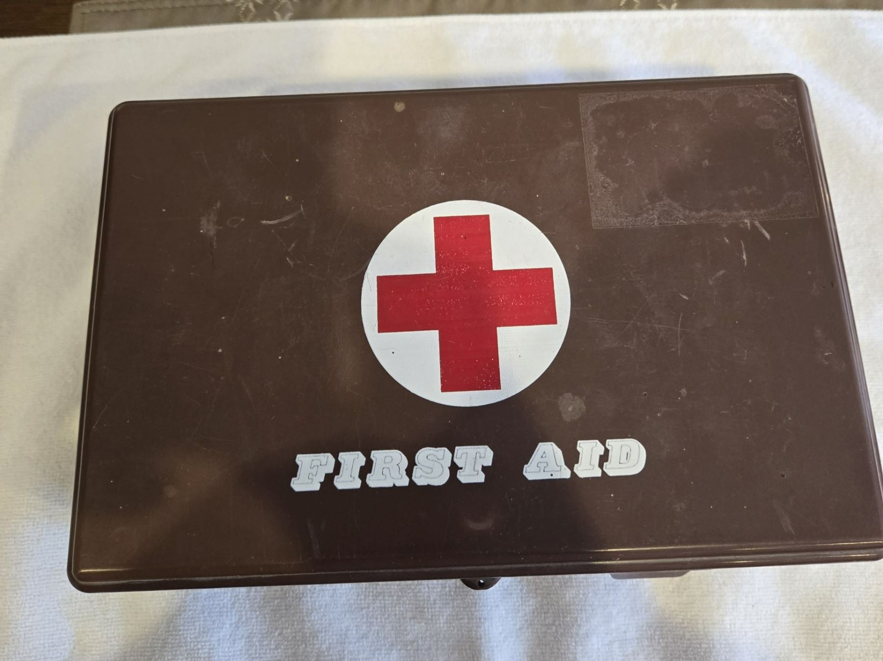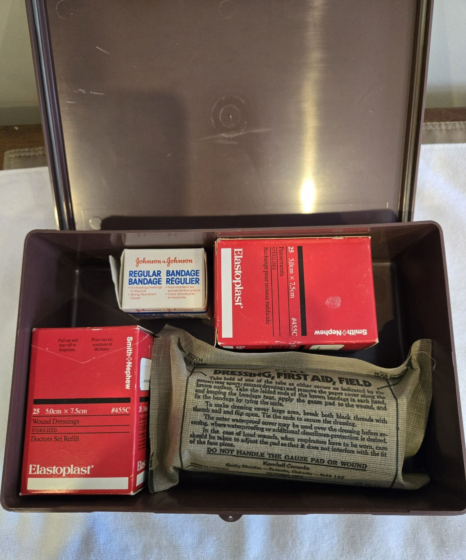 1108 - Vintage brown plastic first aid kit. 1970s or 1980s. Bandaids and wound dressings inside. Kendall Canada field dressing kit from October 1977. 10" x 6 1/2"