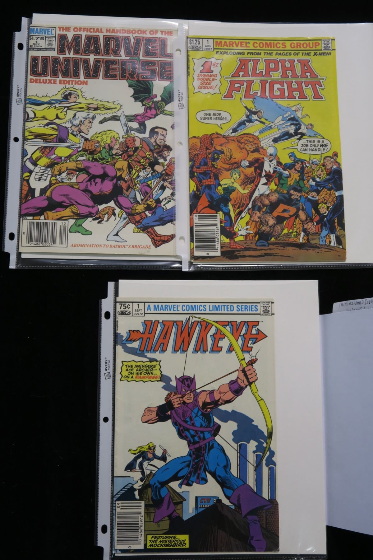 #1156 - Lot of 3 Marvel Comics All #1 Issues Like New : Alpha Flight, Marvel Universe & Hawkeye