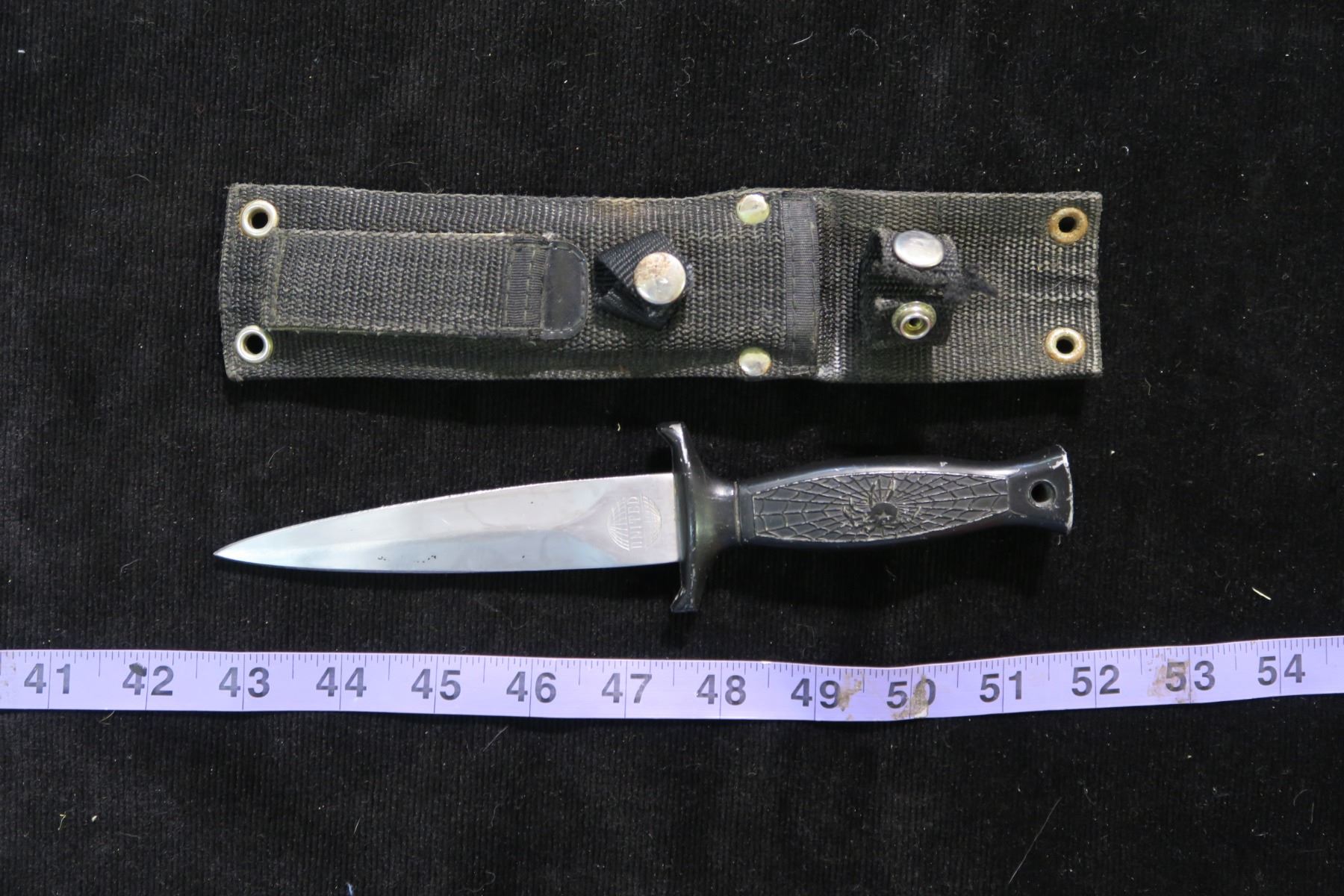 #1185 - Vintage United Cutlery #UC204 Stainless Steel Black Widow Boot Knife with Clip Sheath