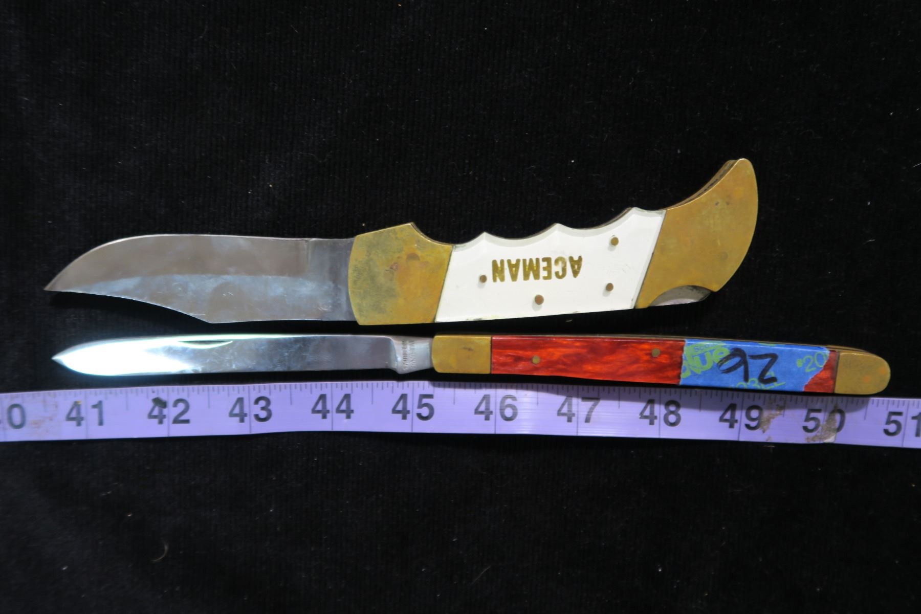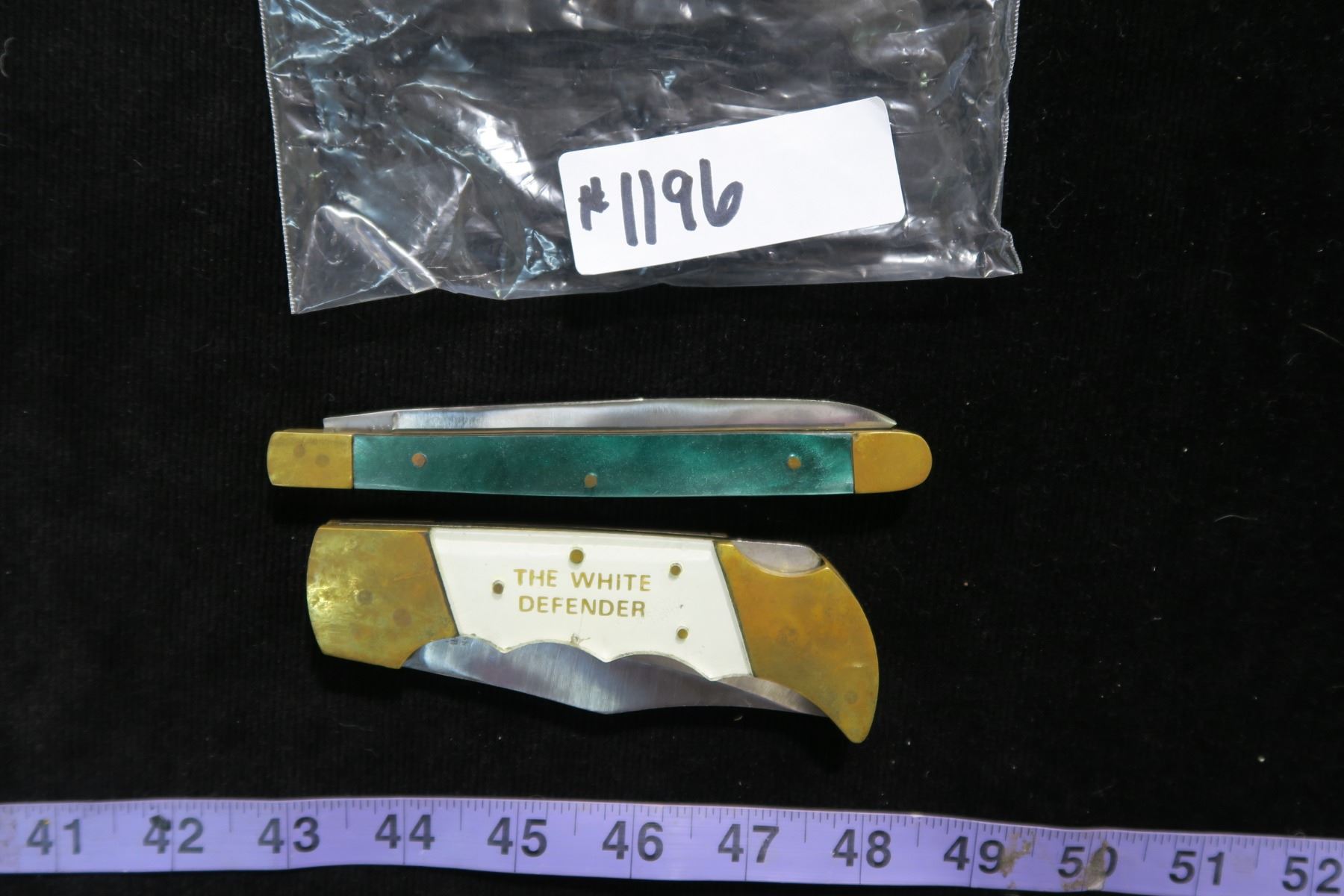#1196 - 2 Vintage Stainless Pakistan Knives; The White Defender and Red and Green Pearlesque handle
