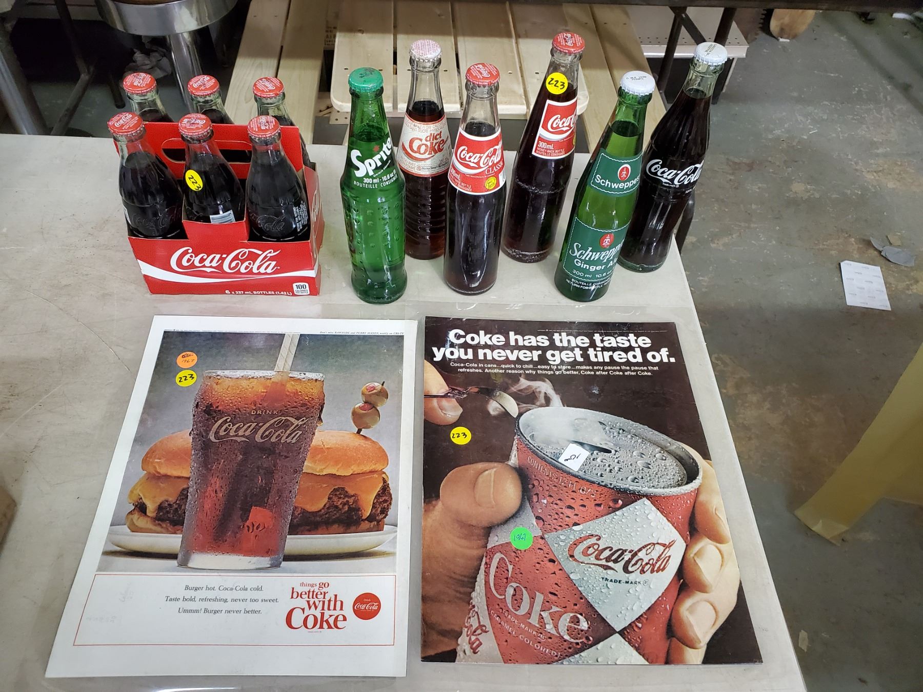 12 FULL POP BOTTLES & TWO COCA COLA ADVERTISING PIECES