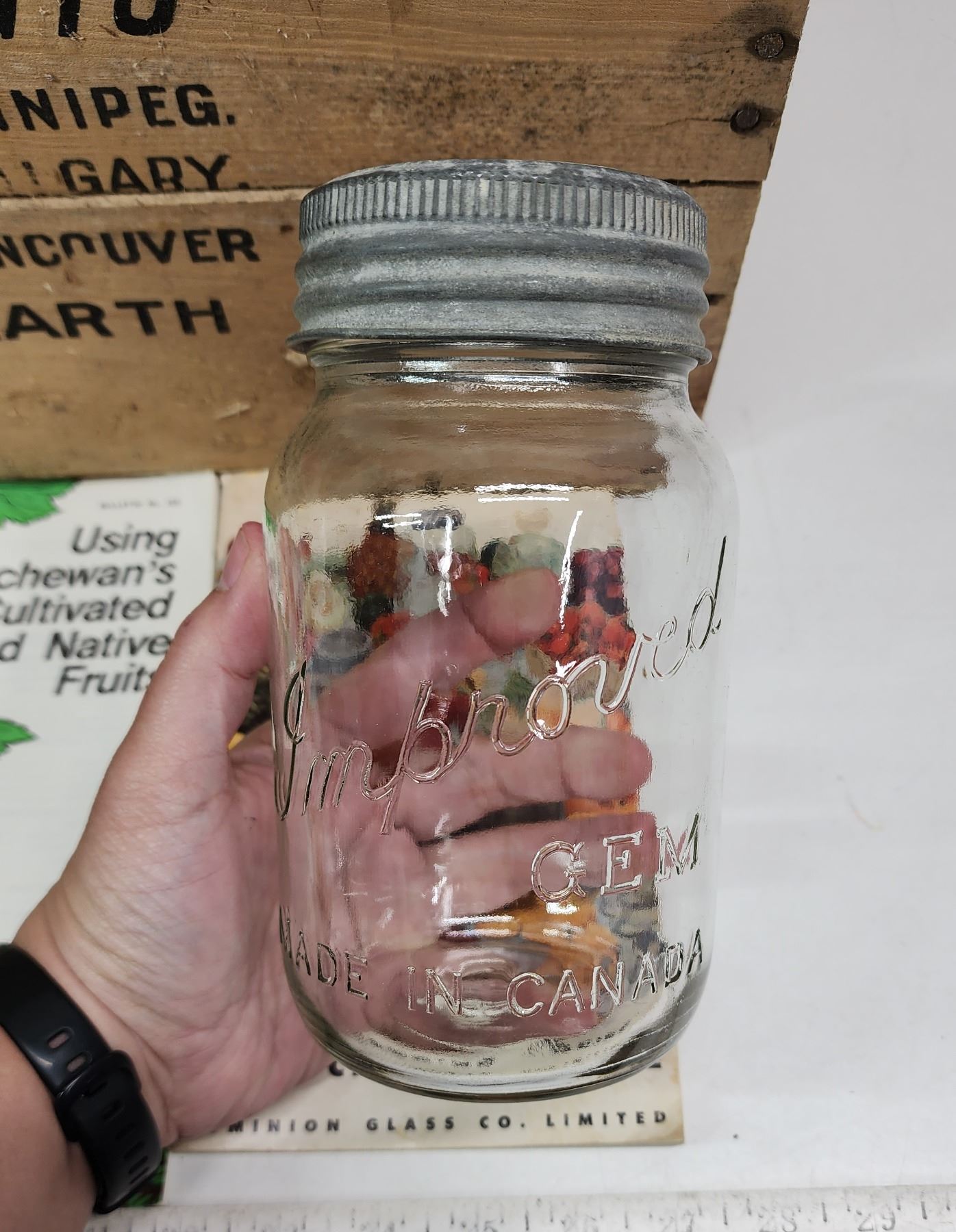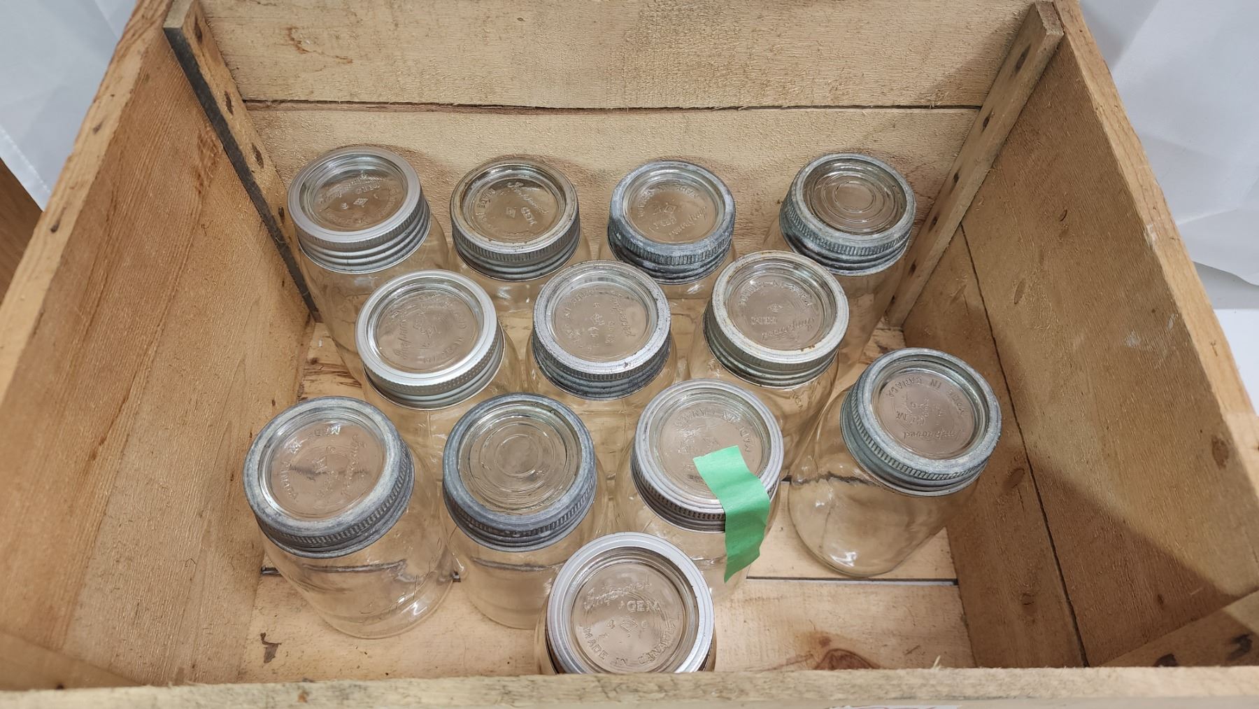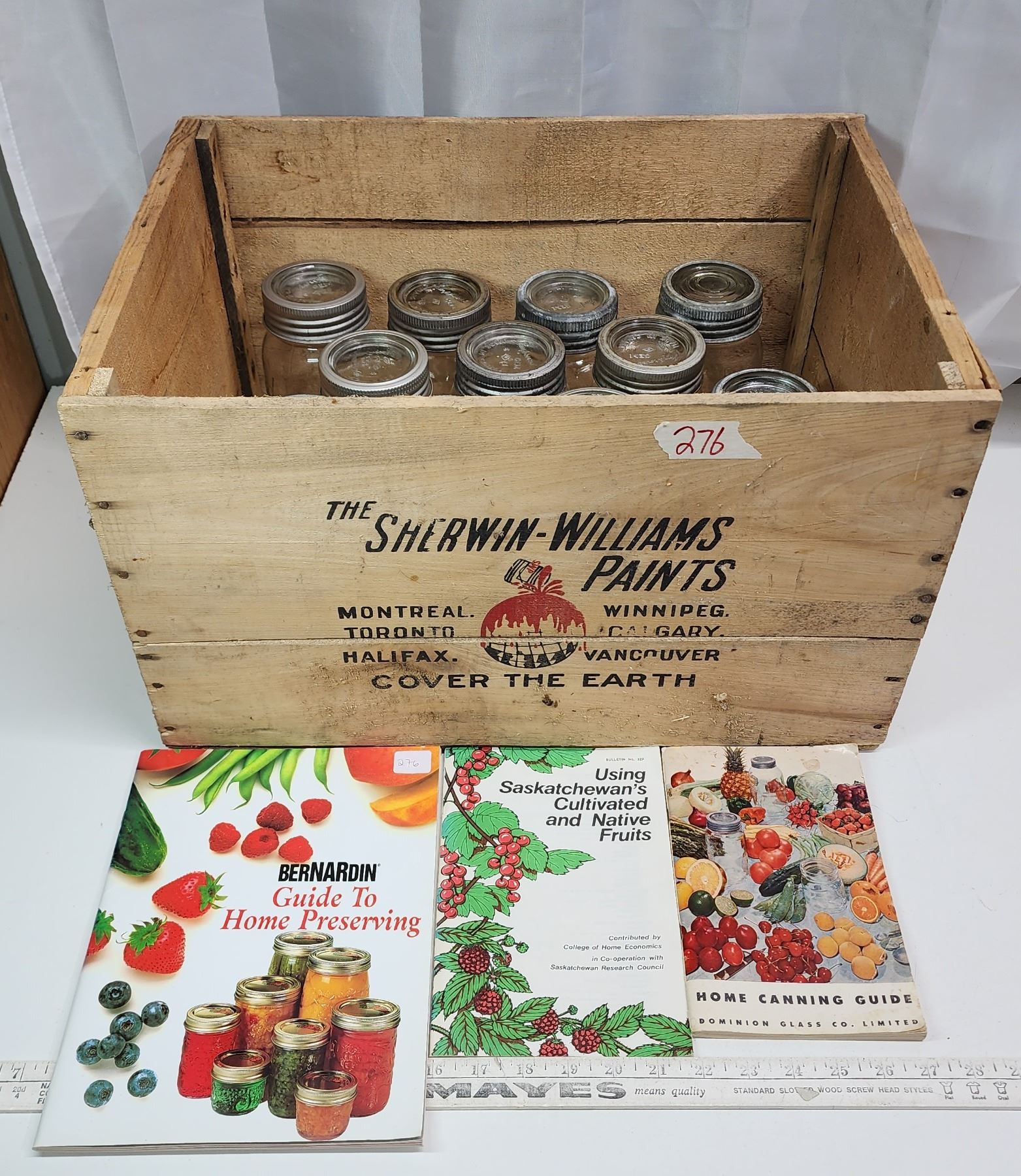 12 “Improved Gem” Quart Sealers Made in Canada with Glass Lids and Canning Books + Wooden “Sherwin Williams” Paint Crate 11.5x20inch