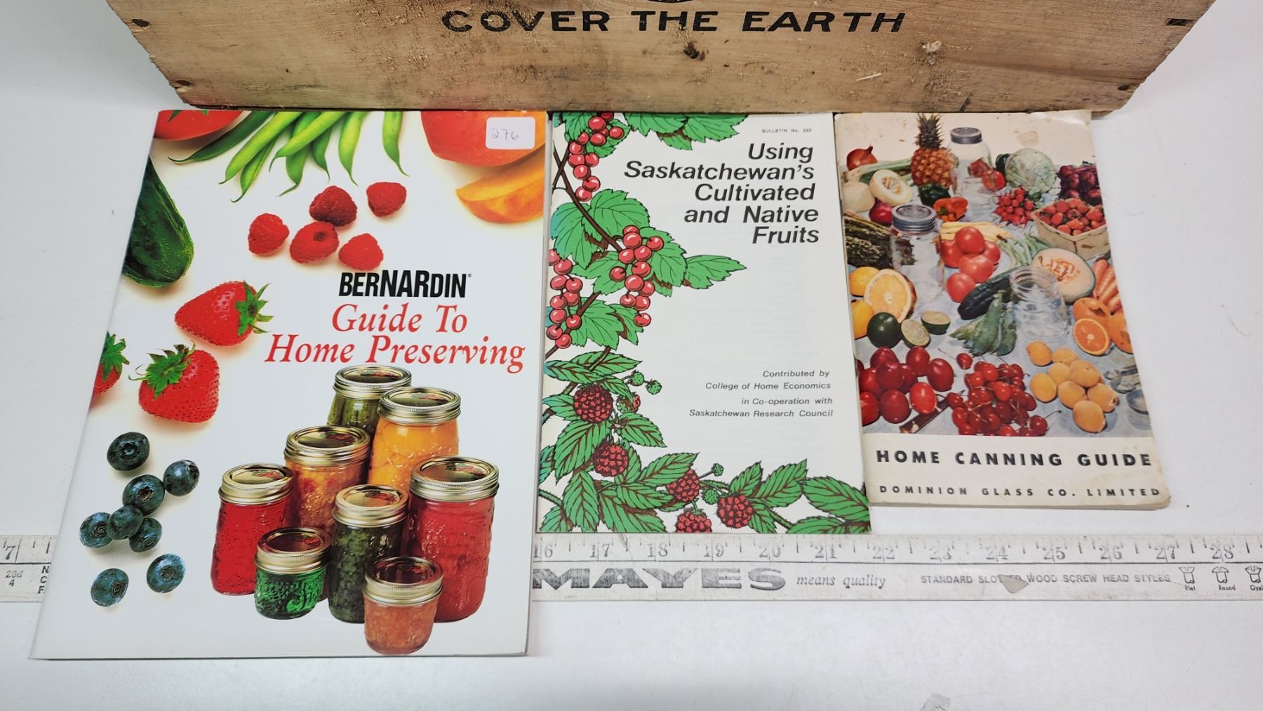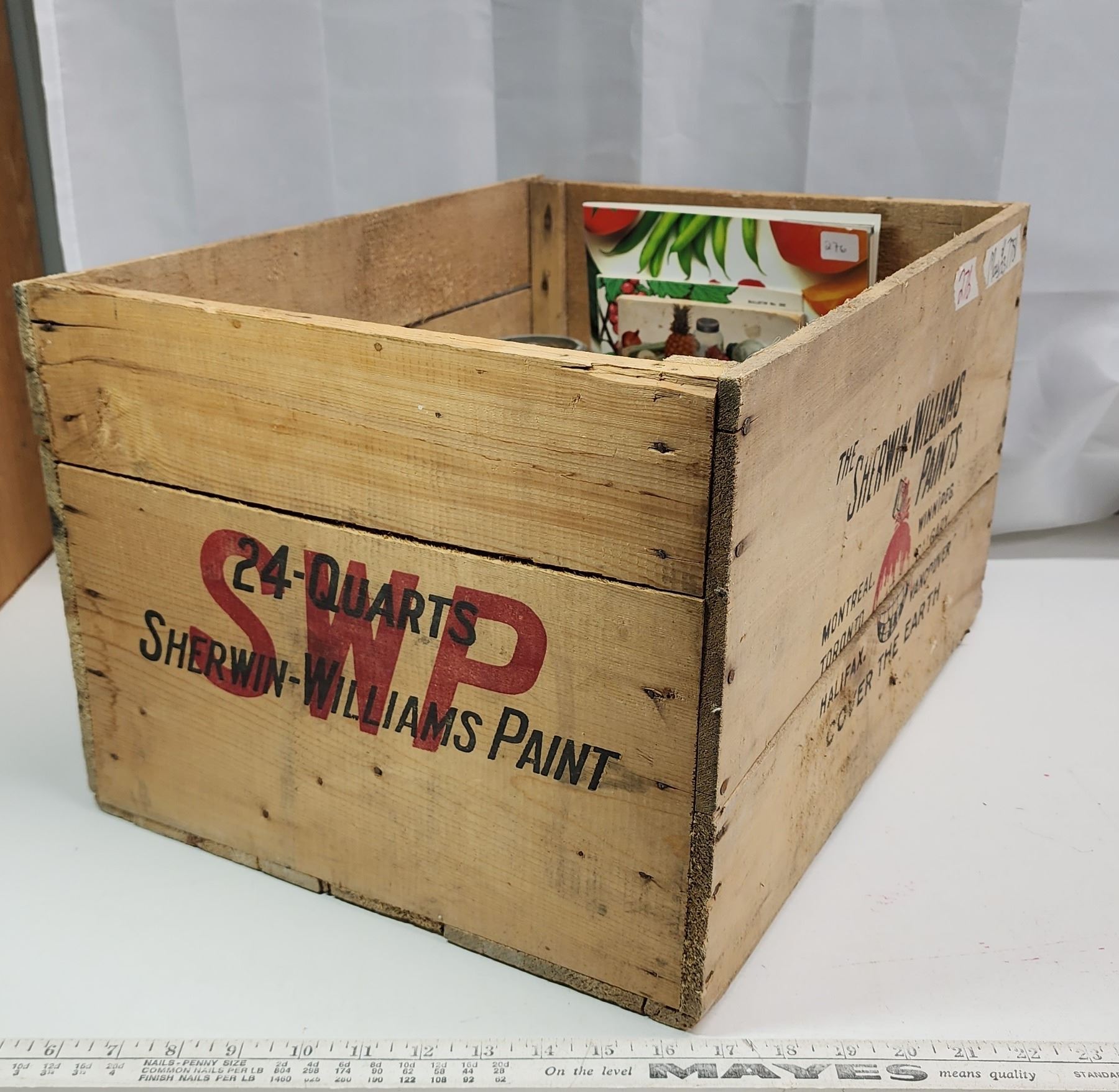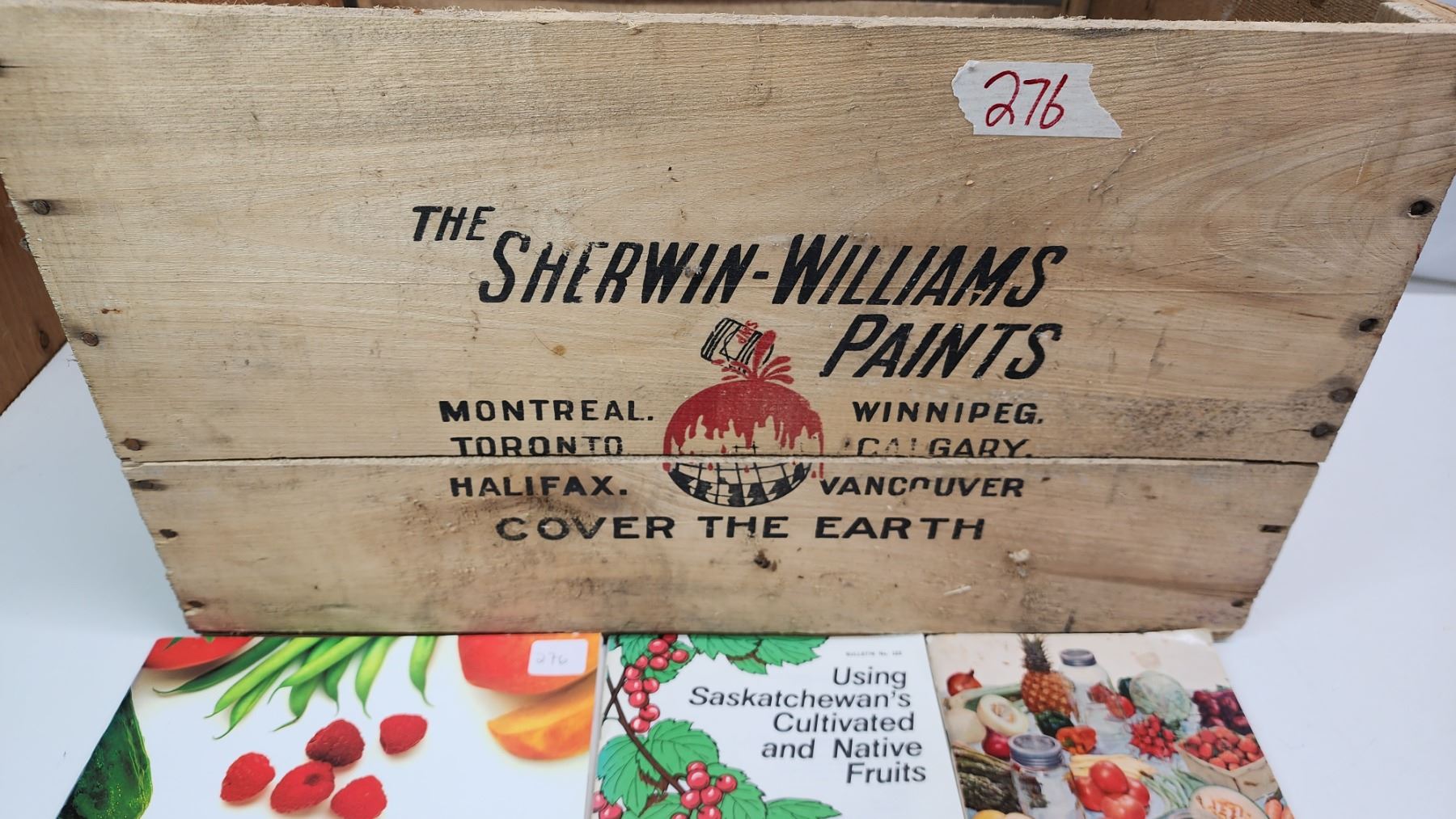 12 “Improved Gem” Quart Sealers Made in Canada with Glass Lids and Canning Books + Wooden “Sherwin Williams” Paint Crate 11.5x20inch