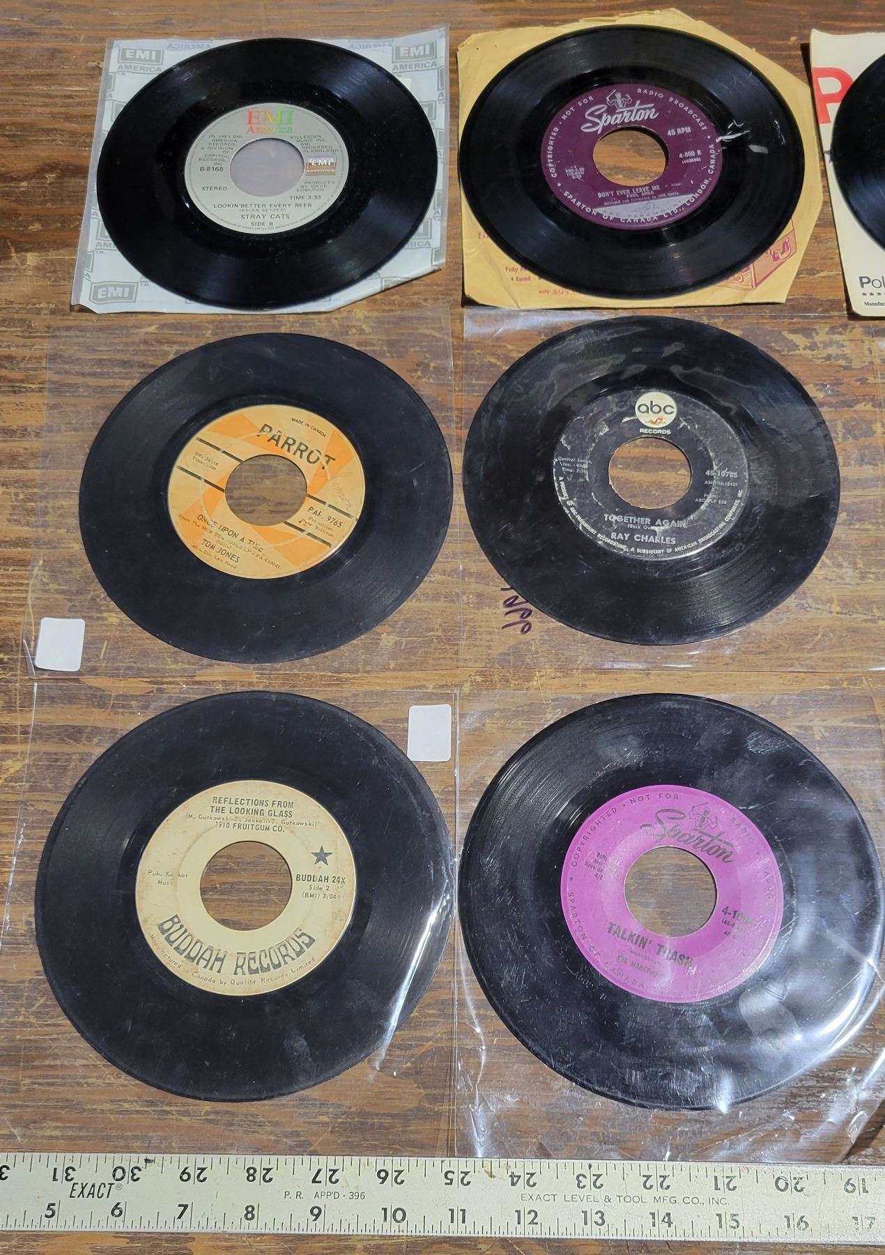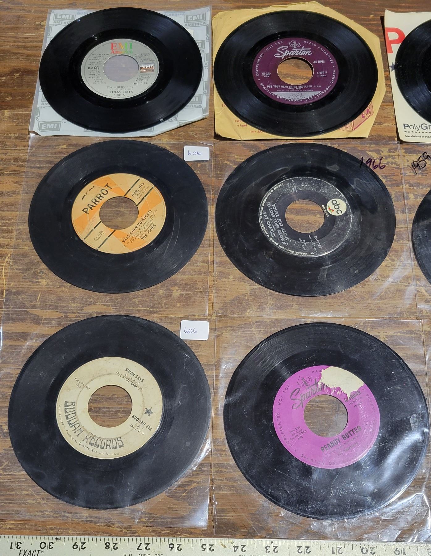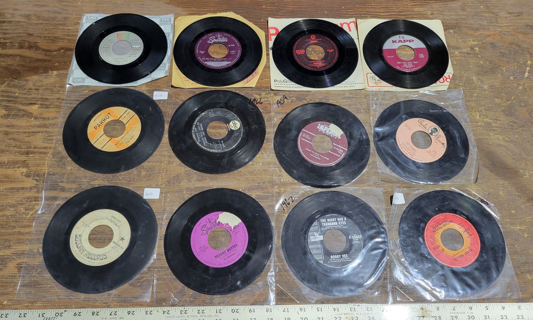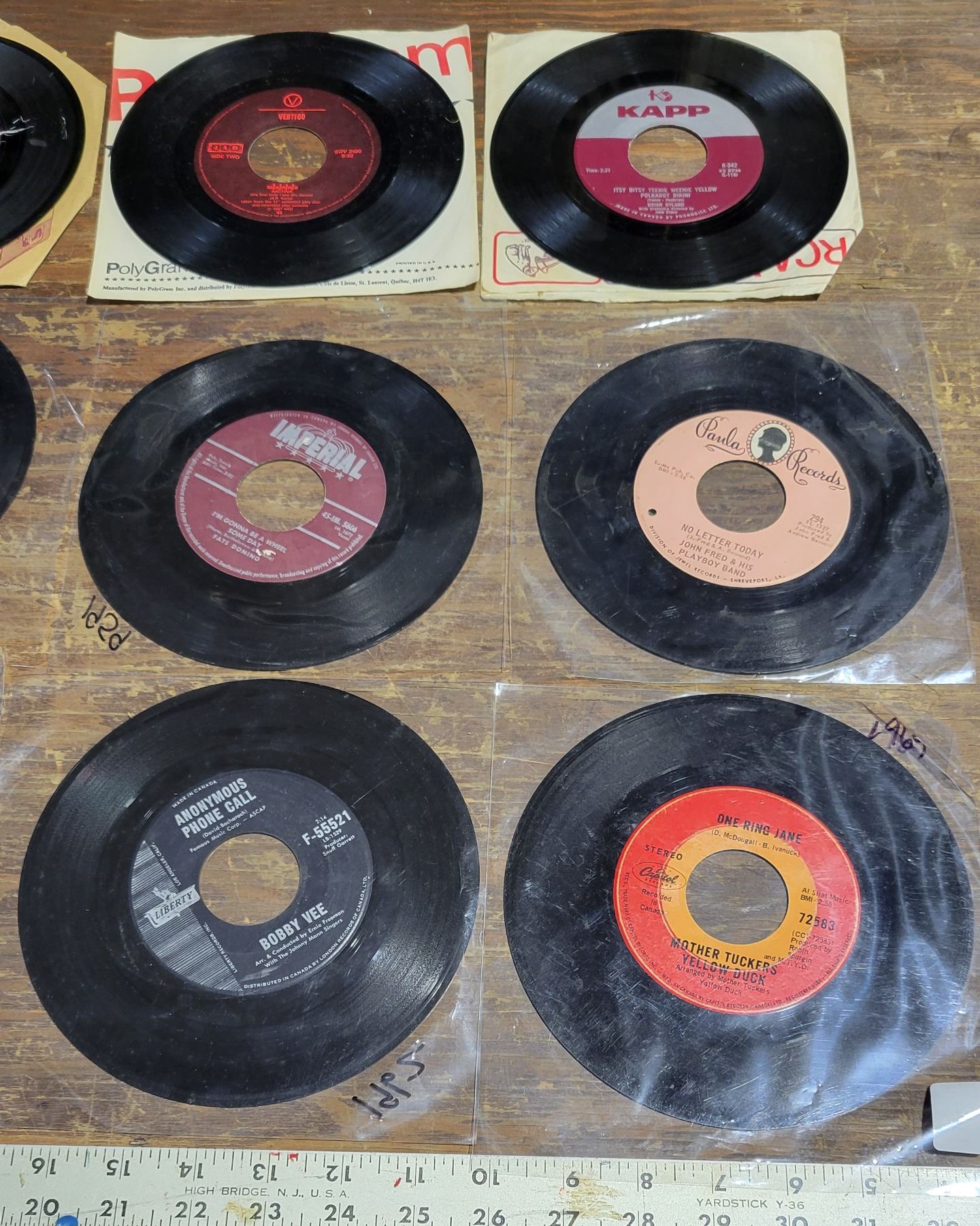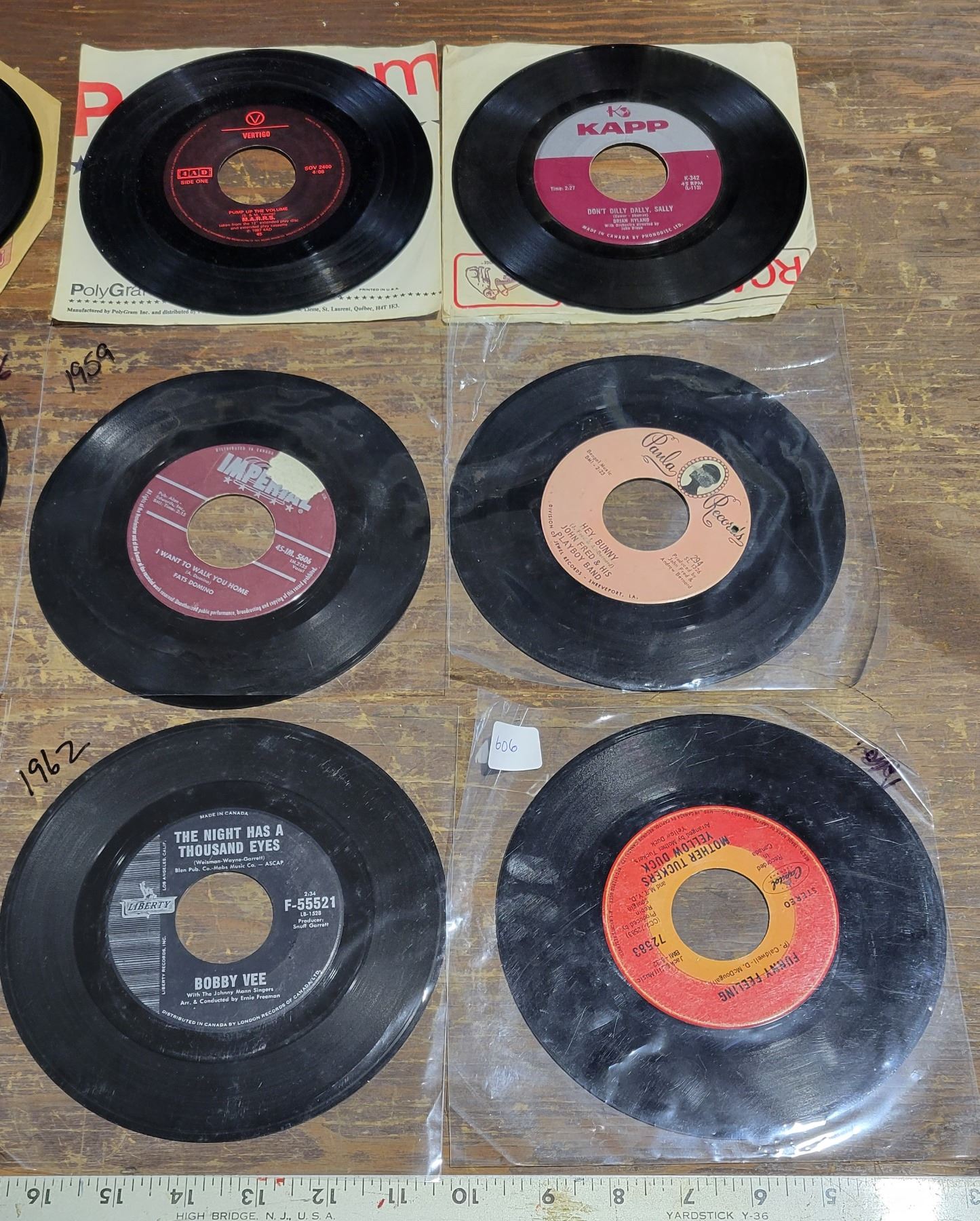 12 Rock 45 LP’s – Hey Bunny – John Fred & His Playboy Band, Pump Up the Volume – M.A.R.R.S, Your Just about to Lose your Clown – Ray Charles, Looking Better Every Beer – Stray Cats, Itsy Bitsy Teenie Weenie Yellow Polka Dot Bikini – Brian Hyland, 1910 Fruit Gum Company – Simon Says, 1962 The Night Has 1000 Eyes – Bobby V, What’s New Pussycat – Tom Jones, Put your Head on my Shoulder – Paul Anka, 1959 I want to Walk you Home – Fats Domino, Mother Truckers Yellow Duck – 1 Ring Jane