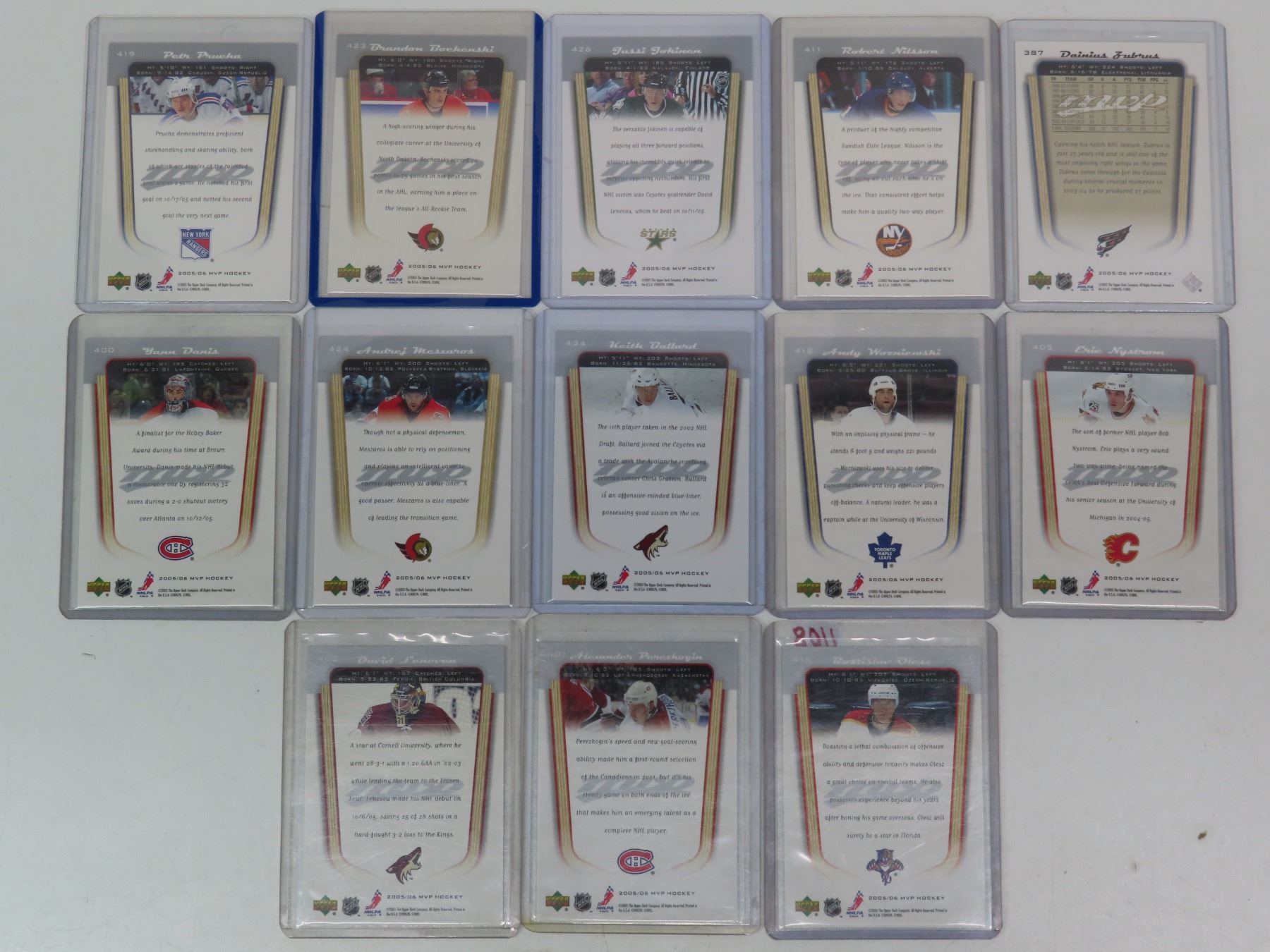 12 assorted "MVP Rookies" series & 1 "MVP Gold" series UpperDeck hockey cards - in plastic holders