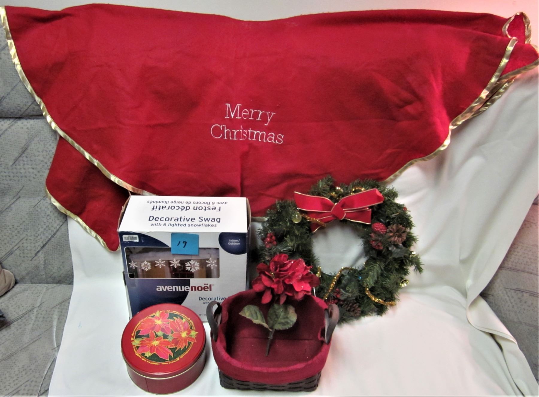 12" door Christmas wreath, 36" tree skirt, 7" Christmas tin, 8X9X5 basket, 7 1/2' mini lights