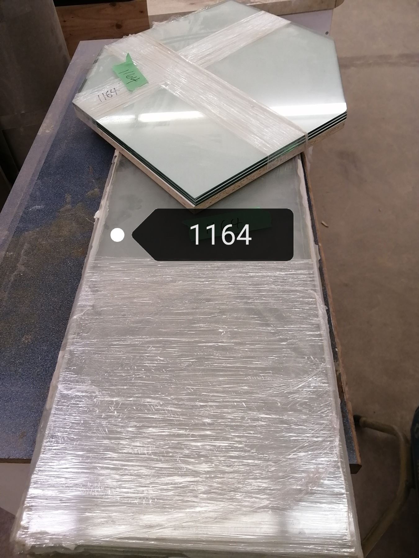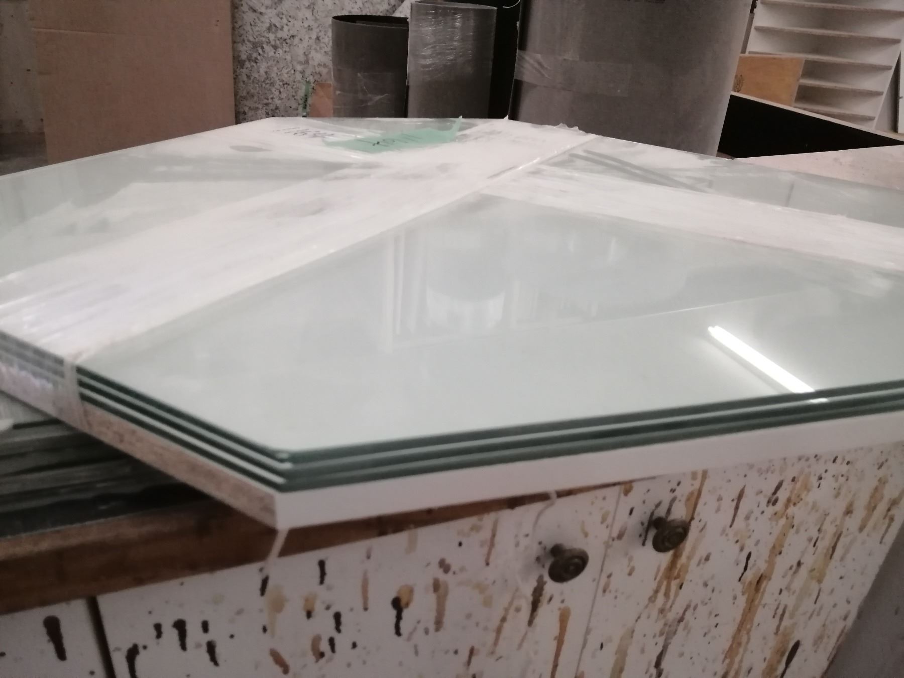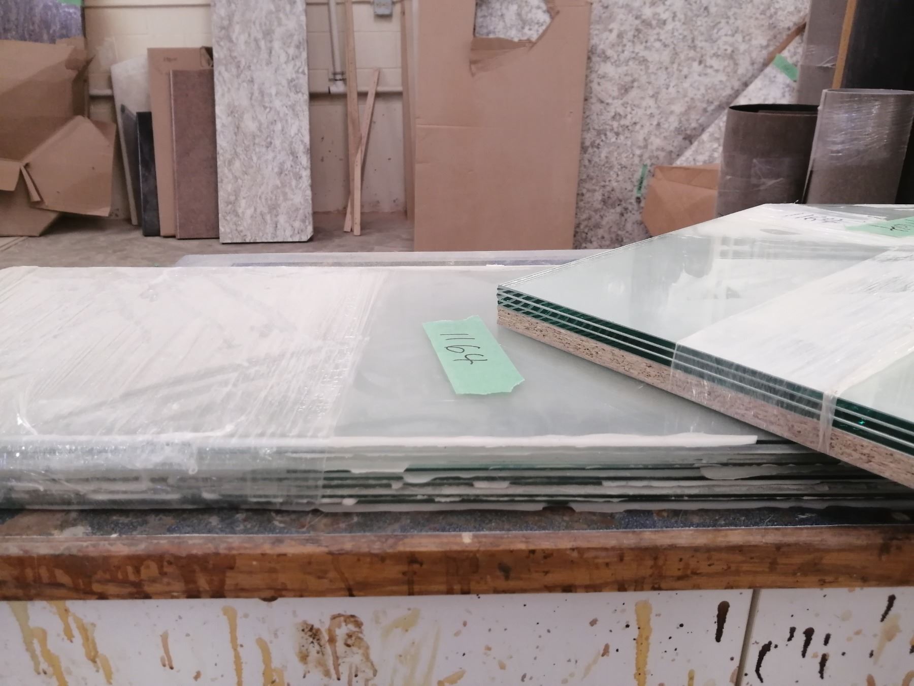 12 pieces of 3mm glass 12 X 48 (used) & 3 pieces of 5mm angled glass corner shelves(new)