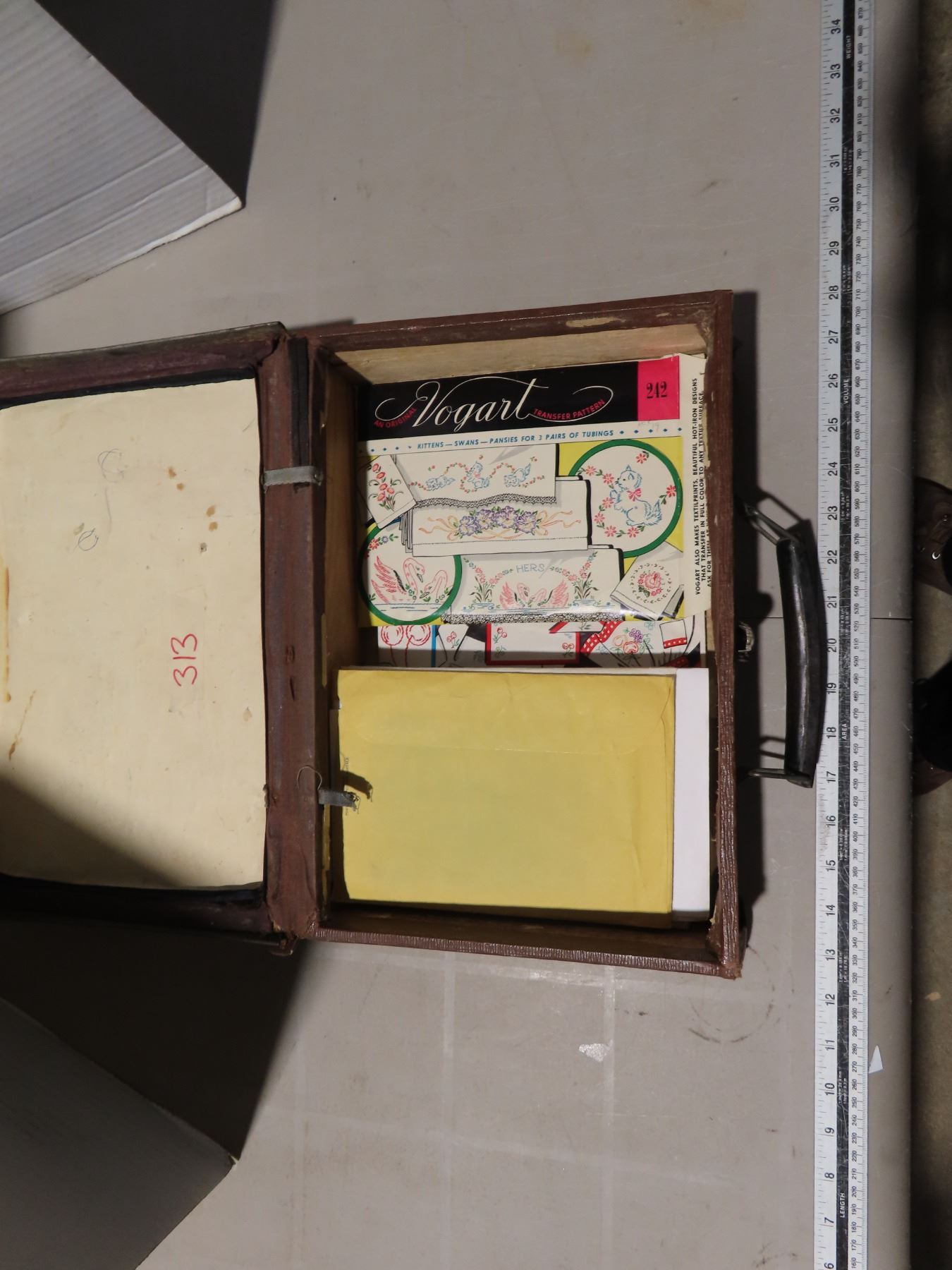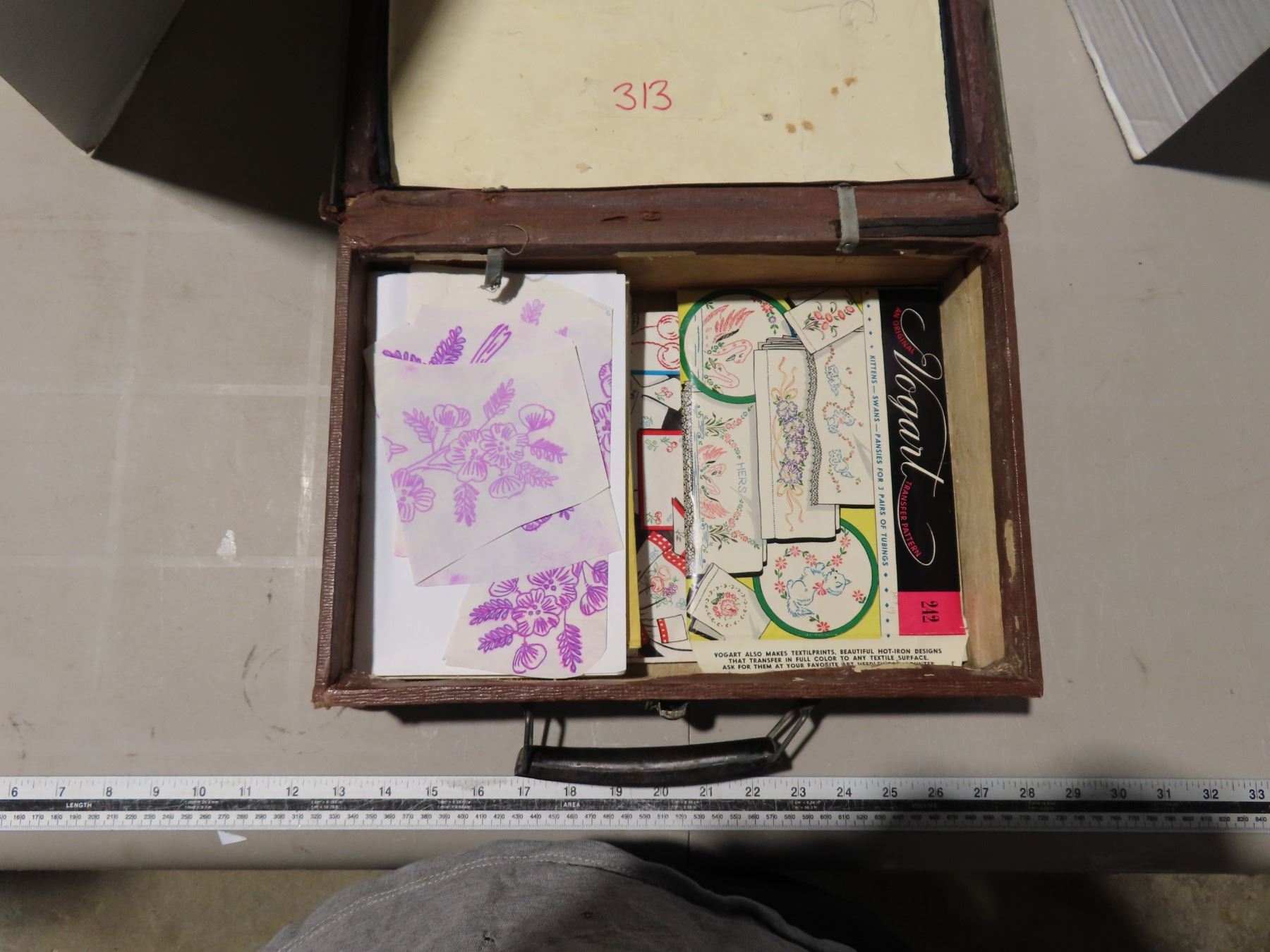 12 transfer needle craft patterens with wood suit case total various pattrens vintage