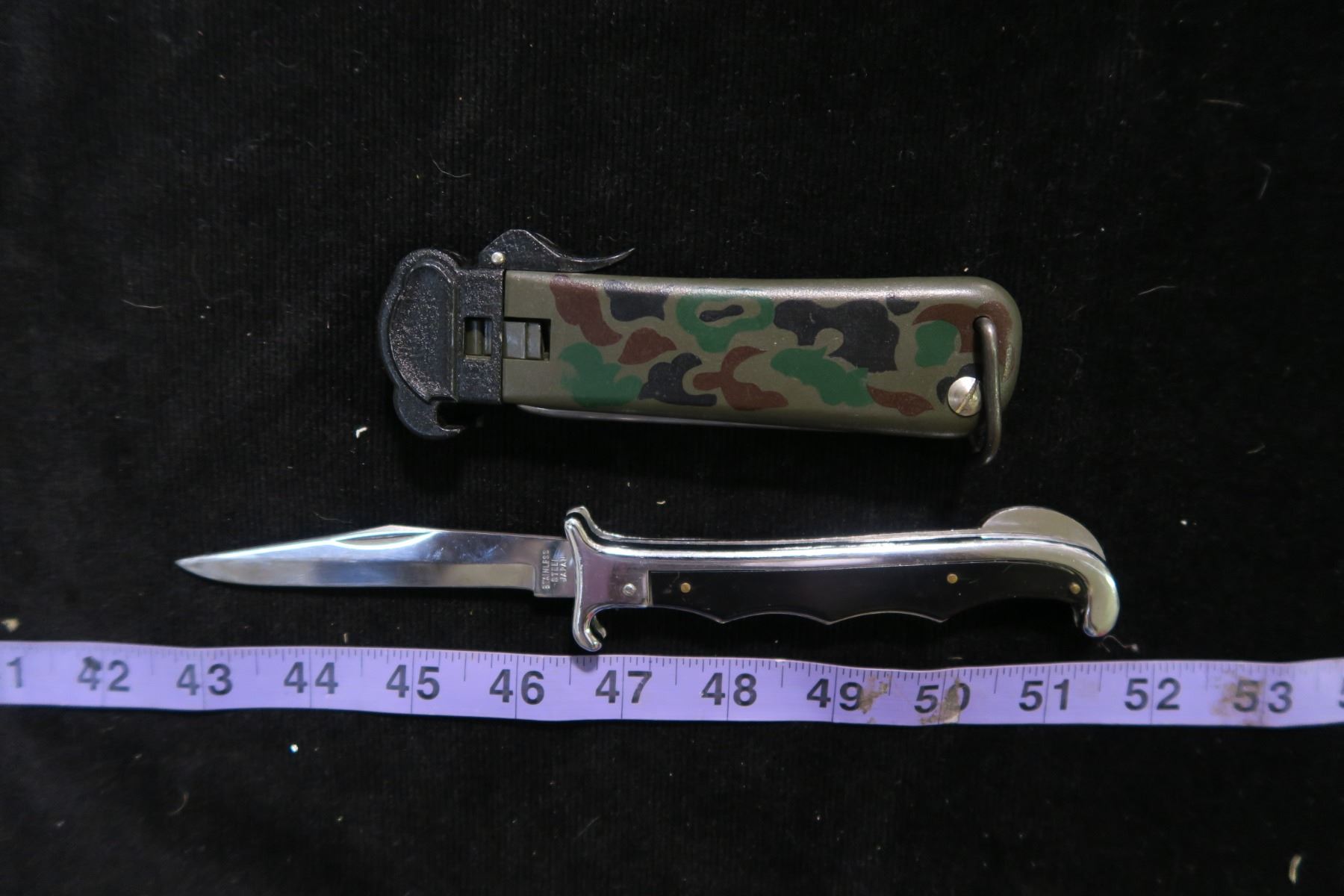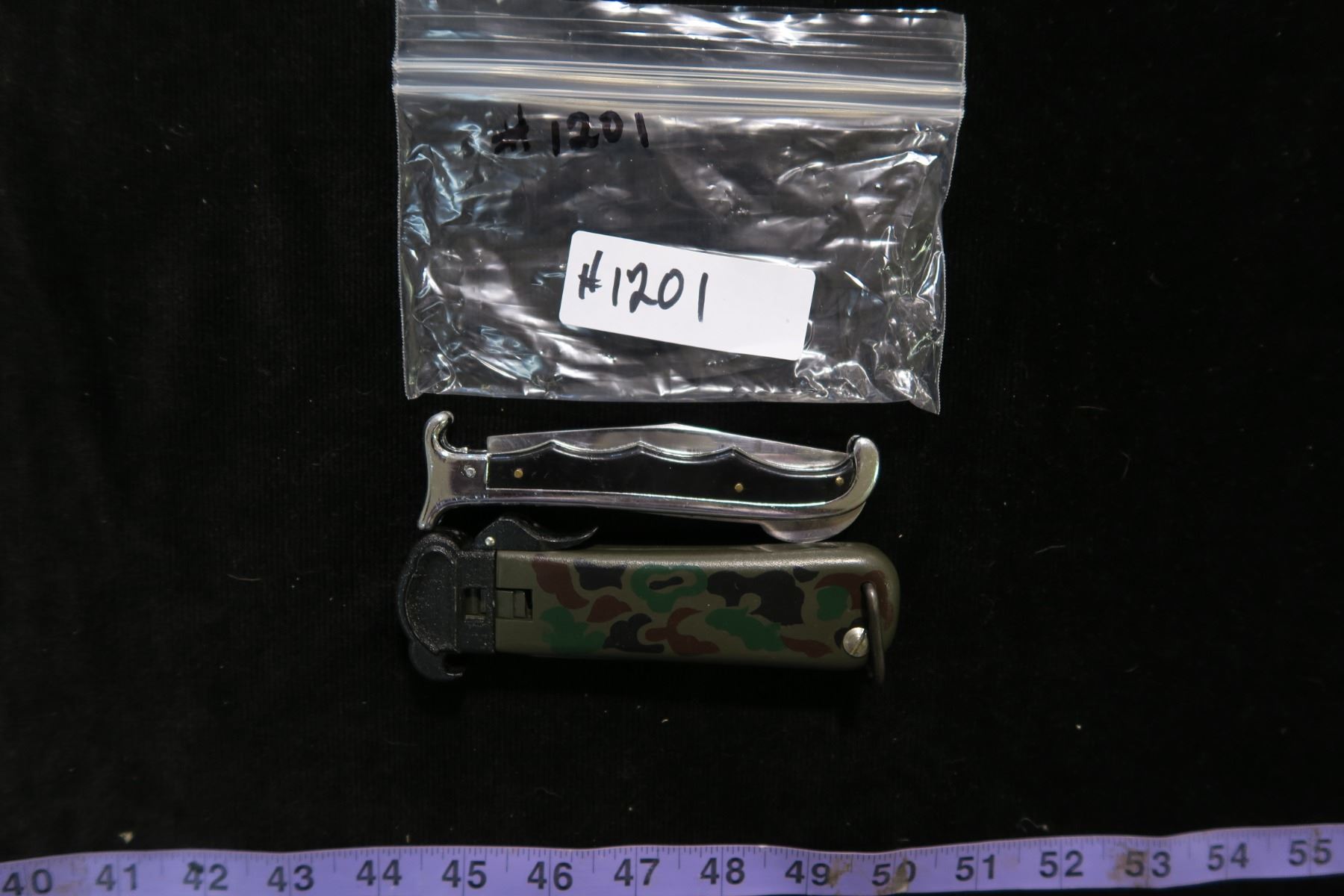 #1201 - Lot of 2 Broken Knives, Silver wont stay shut & Loose Blade, Camo wont eject blade