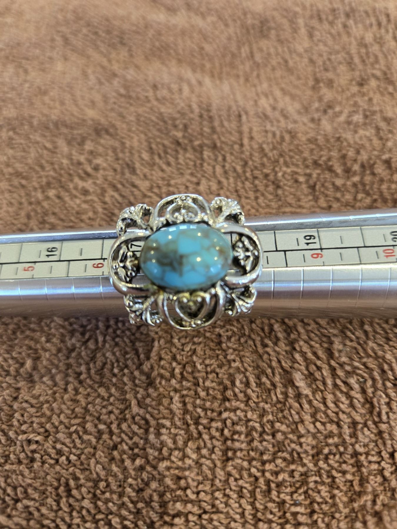 1212- Vintage Sarah Coventry silver tone open work blue marbled centre. Adjustable. Stamper Canada
