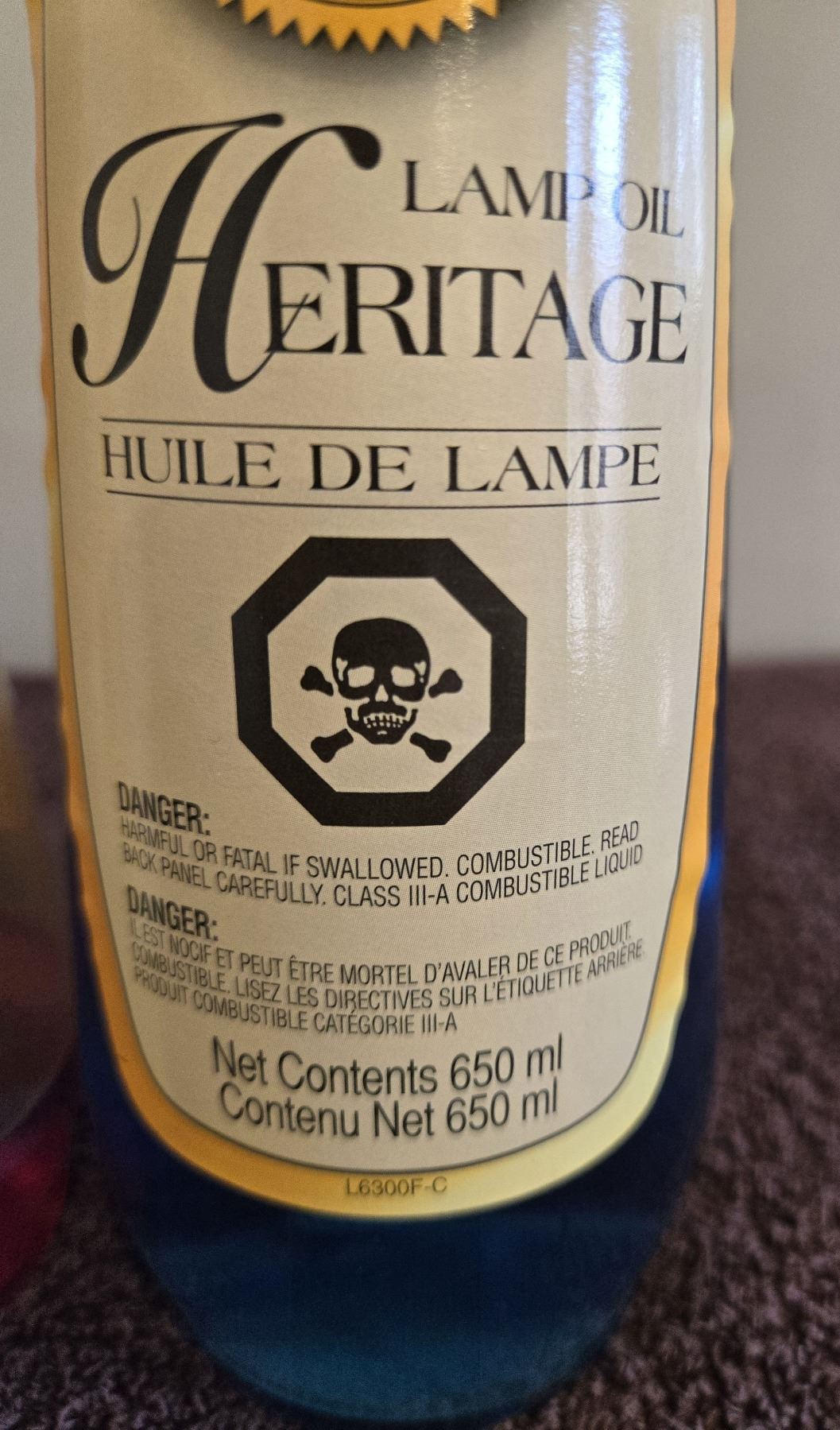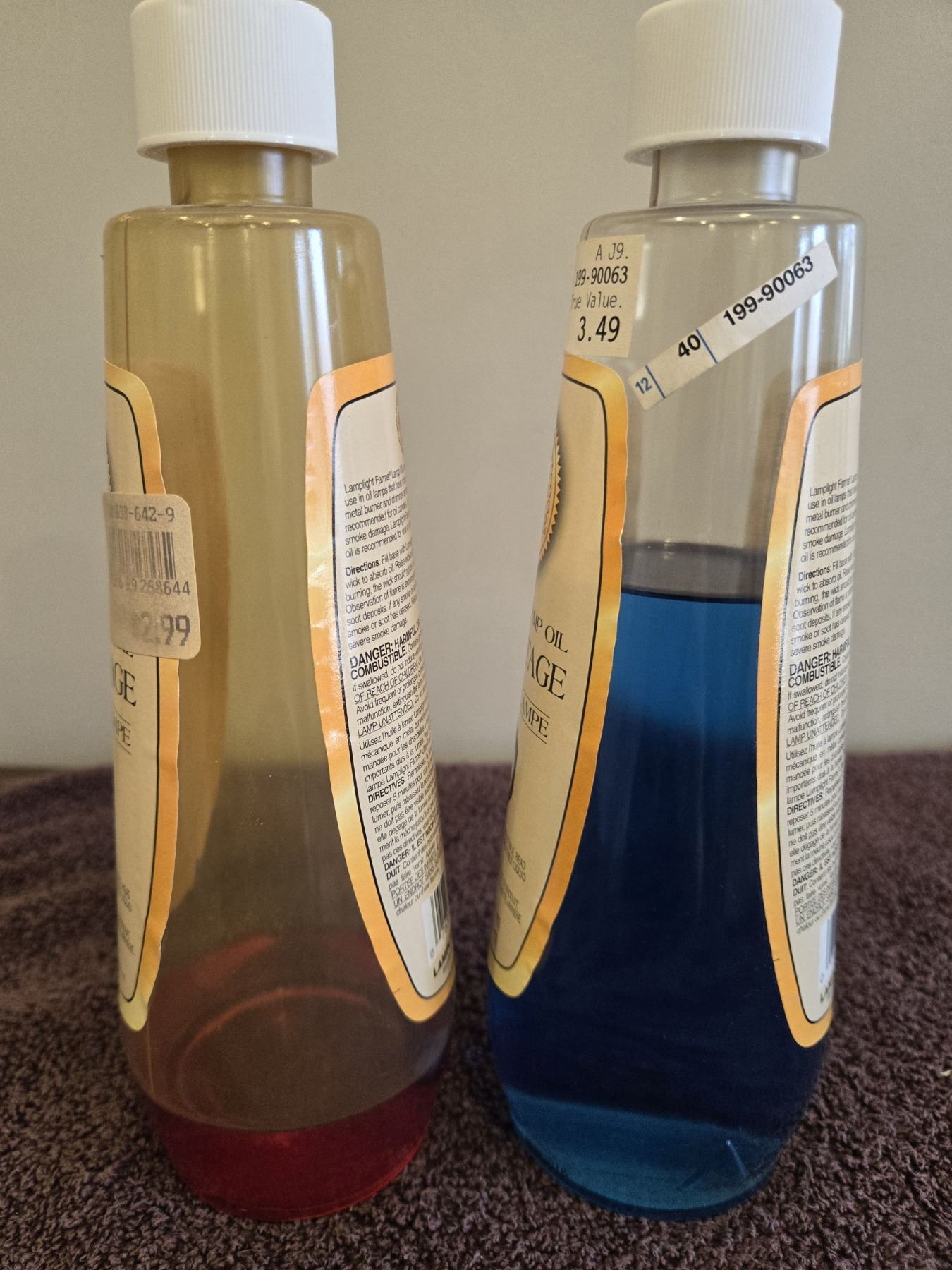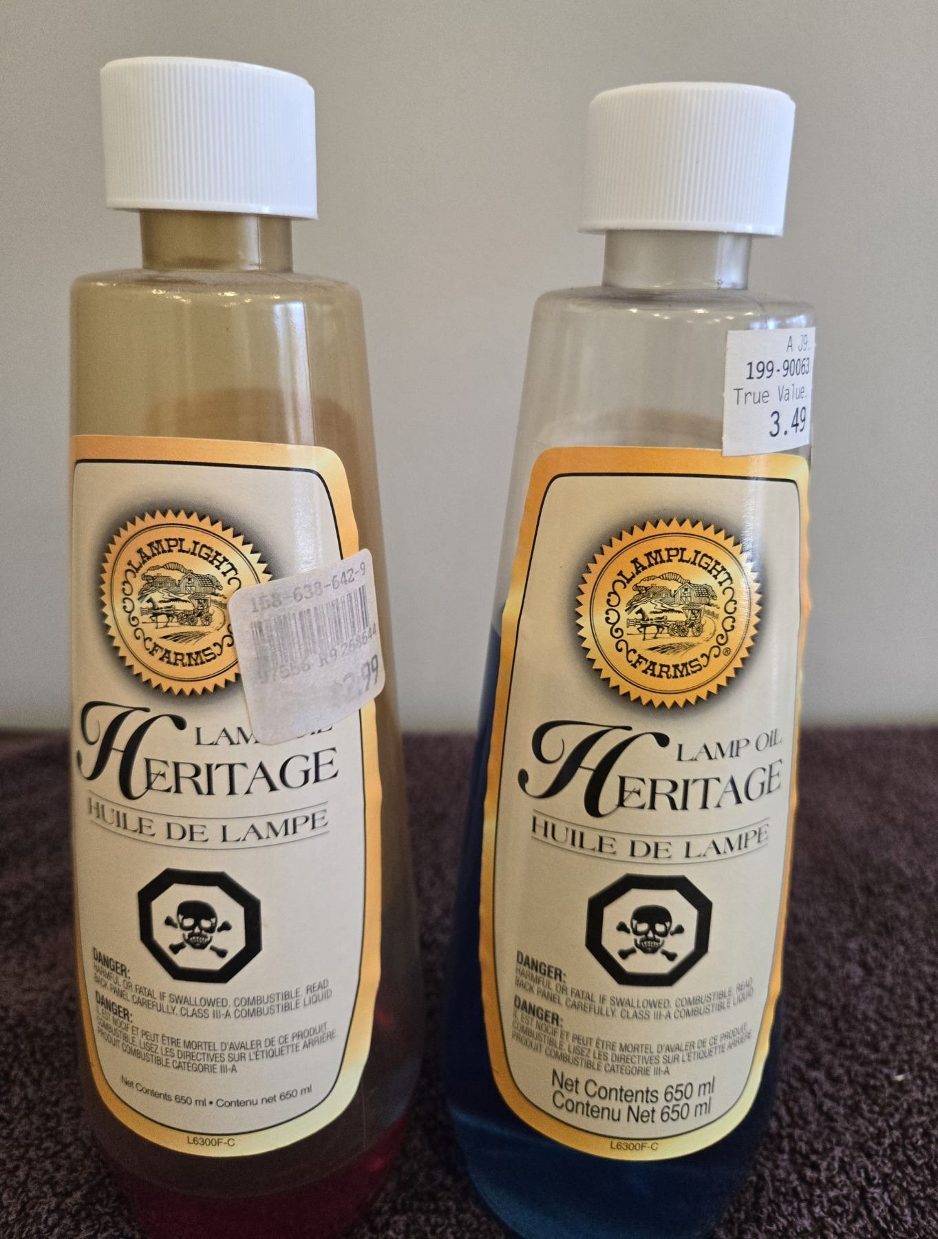 1216 - Lot of 2 opened bottles of Heritage lamp oil. Vintage.