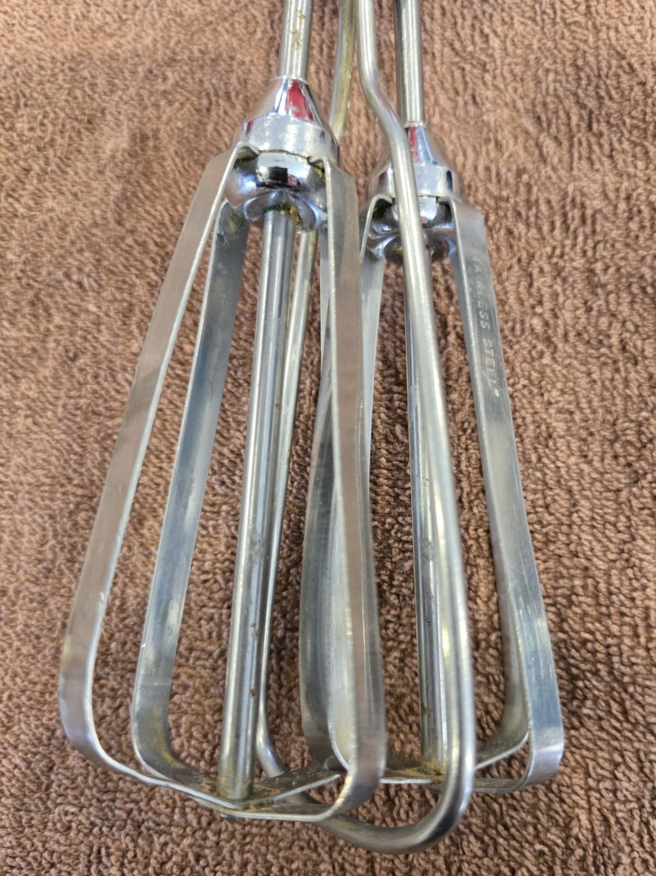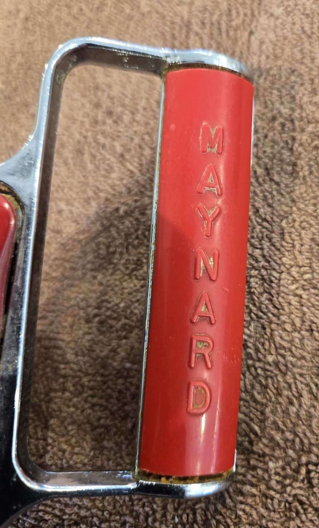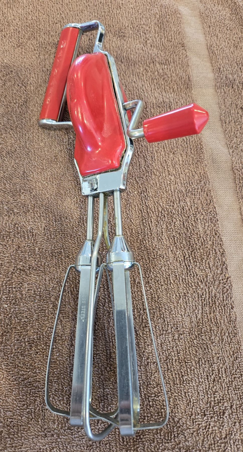1218 - Vintage Maynard stainless steel manual hand mixer/egg beater. Red Bakelite. Great cond.