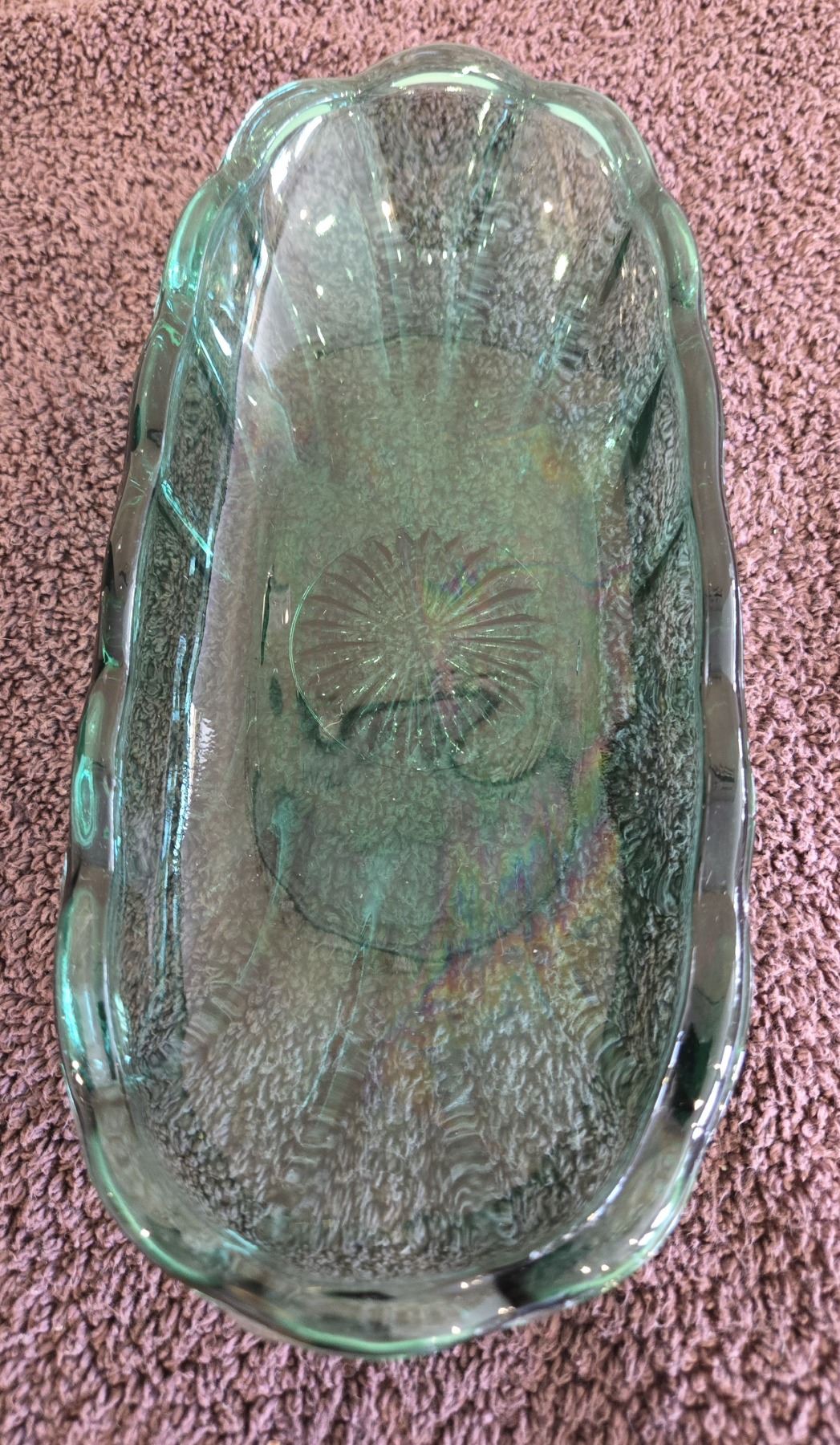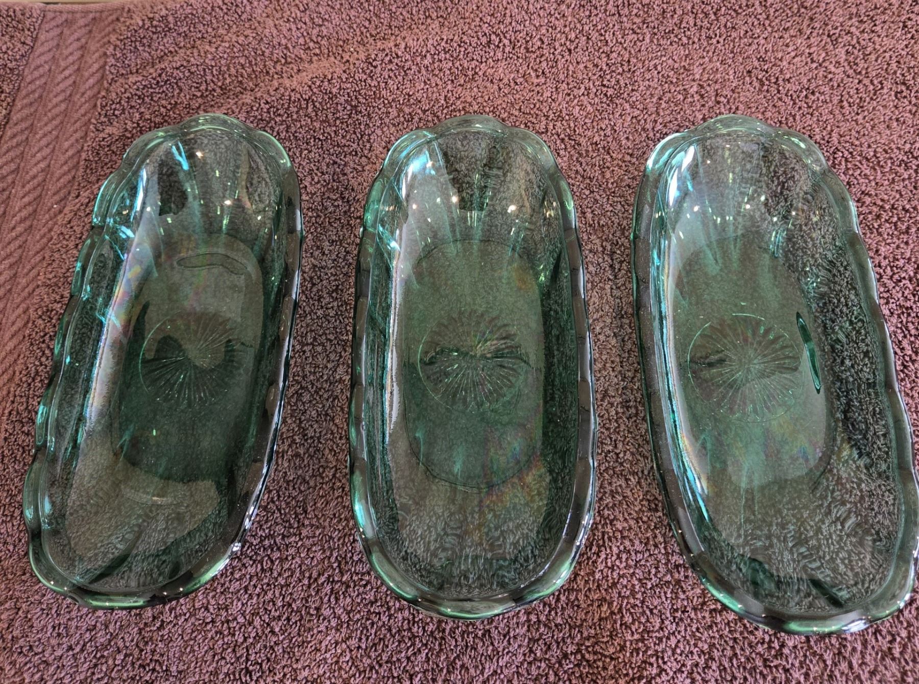 1229 - Set of 3 vintage Anchor Hocking emerald green glass banana split or relish dishes. Heavy, mint cond. 8"